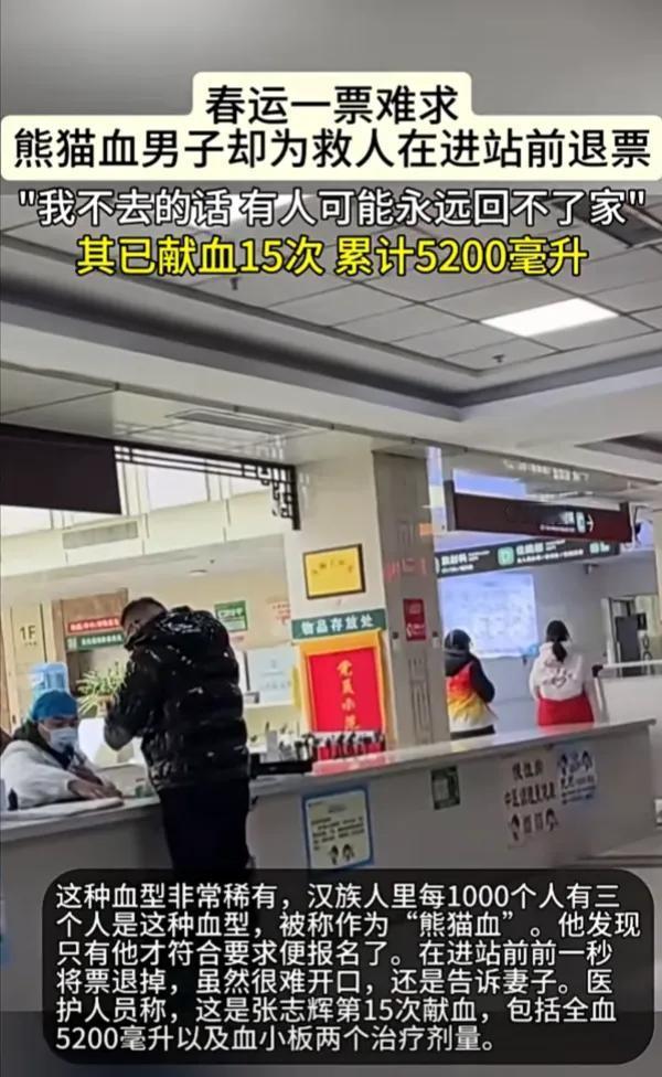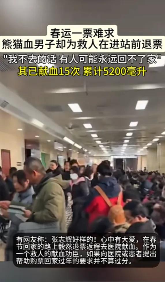 春运一票难求,张志辉却在进站前一秒退了票。 2月13日,武汉汉口火车站人潮涌动。33岁的张志辉牵着5岁的儿子,和妻子一起,攥着好不容易抢到的火车票,准备回山东枣庄老家过年。就在即将进站检票的那一刻,他的手机突然弹出一条消息——“武汉稀有血型之家”群里紧急求助:泰康同济医院急需AB型Rh阴性血小板1人份。 AB型Rh阴性血,就是我们常说的“熊猫血”,在汉族人群里,每1000个人里才有3个是这种血型,极其稀有。更棘手的是,群里的朋友们刚在1月份集体献过血,只有张志辉一个人符合间隔期要求。 没有丝毫犹豫,他立刻退掉了那张抢了很久的车票,让妻子带着儿子先上车回家,自己则转身打车直奔武汉血液中心。他说:“我回家只是早晚的事,可那个等着用血的患者,可能就只有这一次机会了。” 这不是张志辉第一次紧急献血。2017年,他得知自己是稀有血型后,就主动加入了“武汉稀有血型之家”,成了一名“随叫随到”的应急献血者。算上这次,这已经是他第15次献血,累计捐献全血5200毫升,还有2个治疗剂量的血小板。 上午11点30分,张志辉顺利完成了血小板捐献。针头拔出的那一刻,他顾不上休息,立刻拿出手机,点开购票软件,一遍又一遍地刷新页面,重新踏上了返乡的路。 这件事在网上传开后,无数人为他点赞。有人说:“这才是真正的大爱,在自己回家团圆的路上,选择为别人的生命让路。”也有网友心疼他,希望铁路部门能给他安排个舒适的座位,让他好好休息。还有人说,作为救人的献血功臣,他就算向医院或患者提出帮助购票回家的要求,也一点都不过分。 可张志辉自己却觉得,这只是一件再普通不过的事。他说:“我只是做了我应该做的,换作是别人,也会这么做的。” 在这个人人都忙着赶回家过年的春运里,张志辉的选择,像一束光,照亮了我们对“善良”的理解。他让我们看到,真正的英雄,从来都不是站在聚光灯下的人,而是那些在平凡的日子里,愿意为了陌生人的生命,停下自己脚步的普通人。 他放弃的,是一张回家的车票;他守护的,是一个家庭的团圆。他用自己的行动告诉我们,这个世界上,总有人在默默发光,总有人在为了别人的幸福,负重前行。 也正是因为有了像张志辉这样的人,我们才相信,这个世界,永远值得我们去热爱,永远充满了希望。 各位读者你们怎么看?欢迎在评论区讨论。
