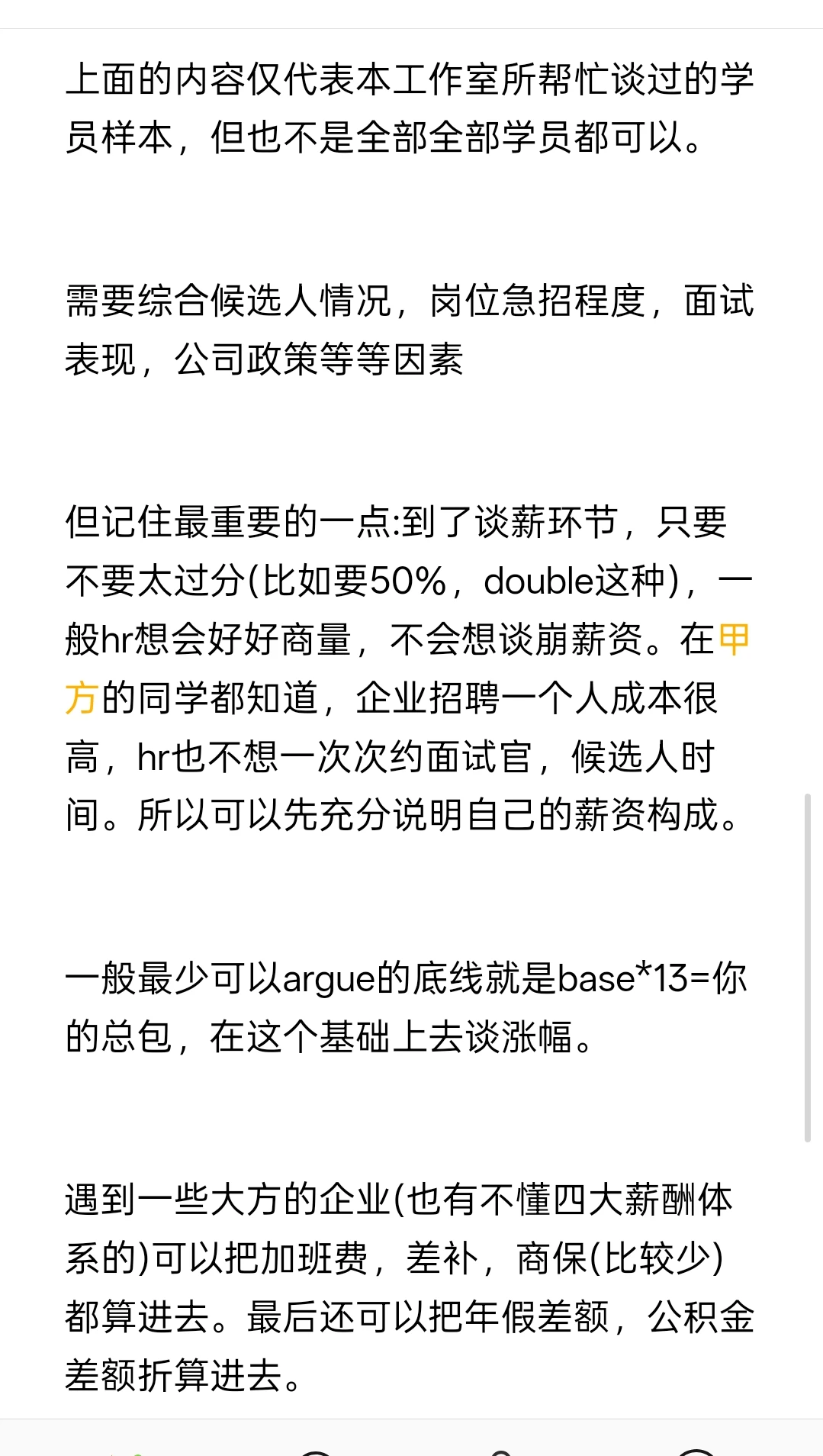 但记住最重要的一点:到了谈薪环节,只要不要太过分(比如要50%,ble这种),一般hr想会好好商量,不会想谈崩薪资。在甲方的同学都知道,企业招聘一个人成本很高,hr也不想一次次约面试官,候选人时间。所以可以先充分说明自己的薪资构成。