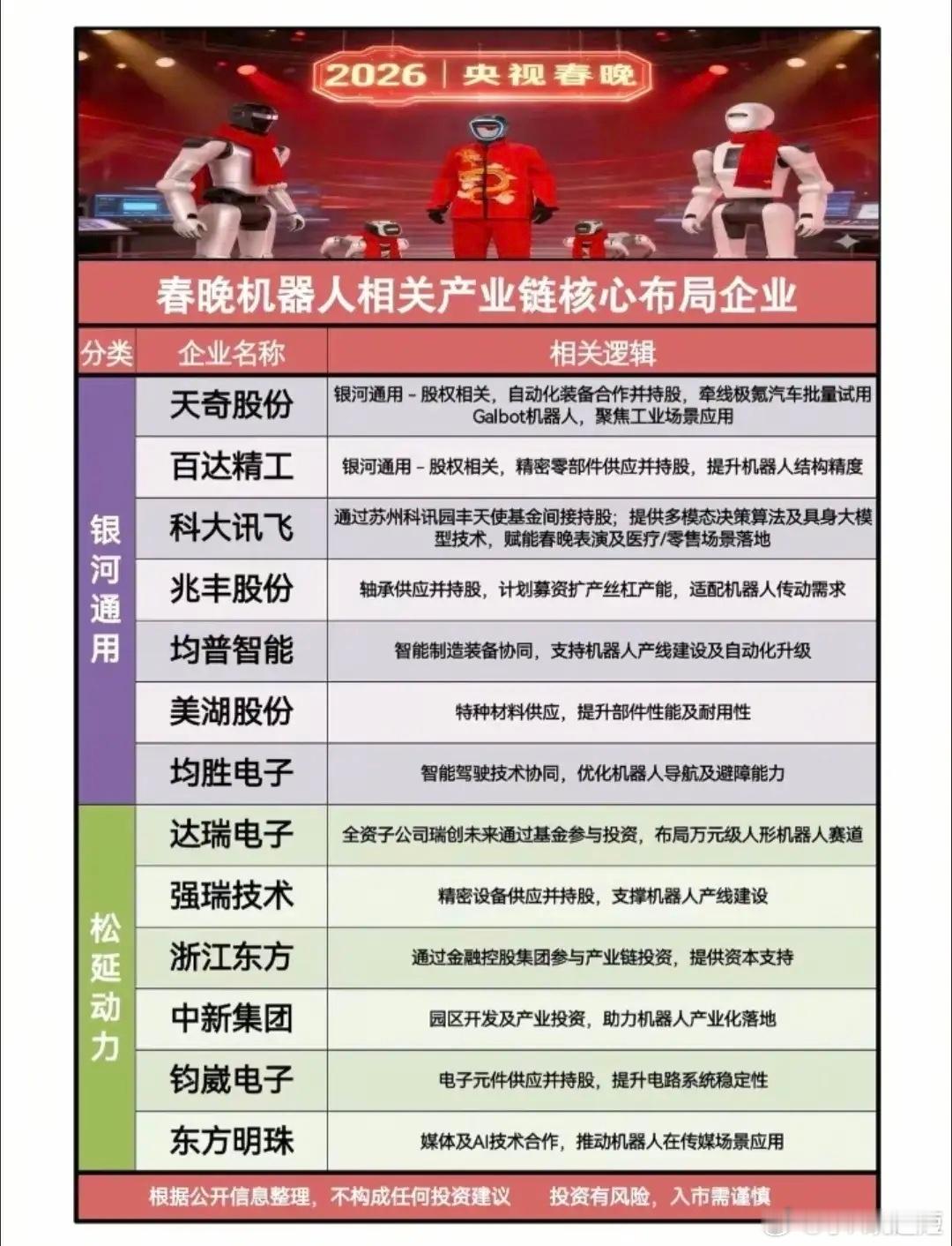2026春晚机器人出圈!一张图看懂背后的产业链布局。四大阵营,数十家核心企业,覆盖材料、芯片、传动、AI全环节,中国高端制造的实力,藏在这份清单里。国产机器人首次组团上春晚,武术、小品、歌舞、微电影全覆盖,运动控制、仿生、具身智能全面秀肌肉。今年的春晚机器人概念能否复制去年的宇树科技大牛行情?相关概念龙头代表有哪些?银河通用概念:具身大模型标杆,工业场景落地领先,与天奇股份、百达精工等深度绑定。