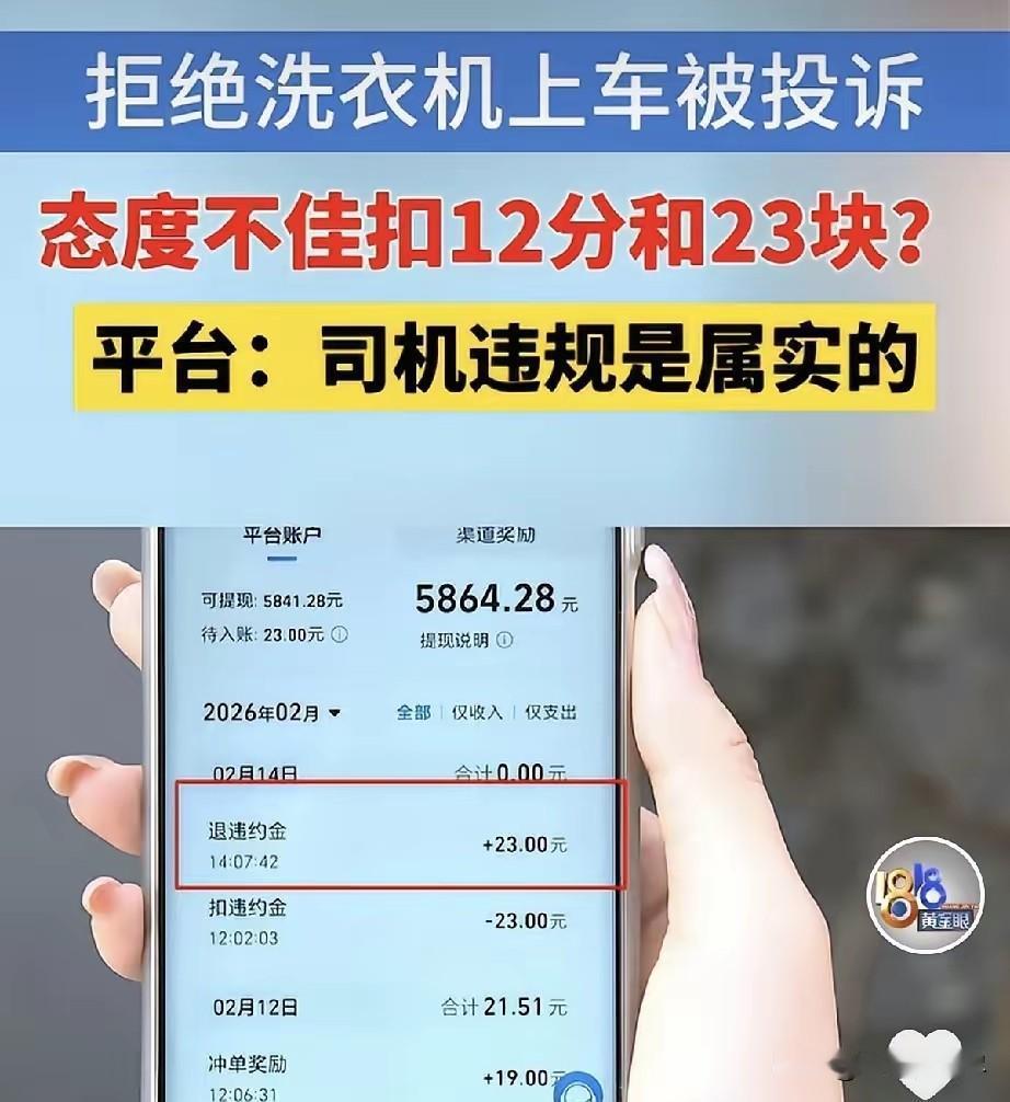 “太难了!”浙江杭州,一女子是网约车司机,她接到订单,发现乘客要带一台洗衣机,可后备箱放不下,女子要乘客取消订单,建议他找货拉拉,不料,乘客取消订单并把她投诉了,说她服务态度不佳,女子被罚23元扣12分,女子火冒三丈,找平台理论,非要平台还给她23元: 钱不多,咽不下这口气! 浙江杭州一名网约车女司机日常接单时,因乘客携带一台家用洗衣机超出车辆承载范围无法承运,建议乘客取消订单并更换货运车辆,却被乘客以服务态度不佳投诉,最终被平台处以罚款23元、扣除服务分12分的处理,这件事在当地网约车司机群体中引发广泛关注。 这名女司机长期在杭州城区从事网约车运营,驾驶的是常规五座家用轿车,车辆设计仅用于载人及携带小型随身行李,后备箱空间有限,无法容纳洗衣机、冰箱等大型家电。 事发当天,她正常接收平台派单,按照导航准时抵达乘客指定的上车地点,停车后便看到乘客站在路边,身旁放着一台带有完整外包装的家用洗衣机,箱体尺寸明显超过普通行李箱,重量也较大,属于典型的大件货物。 女司机第一时间绕车查看,尝试将洗衣机推入后备箱,发现箱体长度和宽度都超出后备箱开口与内部纵深,即便放倒后排座椅,也无法顺利放入,同时会占用全部乘坐空间,影响行车安全且不符合网约车运营规范。 确认无法装载后,女司机向乘客清晰说明车辆空间限制,告知对方网约车不具备运输大型家电的条件,建议乘客取消当前订单,选择专门的货运平台完成运输。 整个沟通过程平稳,没有争执与不愉快,乘客听完后当场操作取消订单,女司机没有多想便驾车离开,继续投入后续接单工作,以为这件事就此结束。 没过多久,女司机打开司机端后台时,突然收到平台发出的处罚通知,通知内容显示,该订单因乘客投诉服务态度不佳, 平台经审核后对她作出罚款23元、扣除服务分12分的决定。23元的罚款金额不高,但12分的服务分扣除对日常运营影响明显, 服务分直接关联派单优先级、活动参与资格与口碑评级,分数下降会导致优质订单减少、收入受影响。 女司机看到处罚结果后十分不解,她始终认为自己只是客观陈述车辆实际情况,没有言语不当、推诿拒载等行为,完全是基于车辆安全与运营规则作出的合理说明,不应该被认定为服务态度不佳。 为了维护自身权益,女司机通过平台内置客服通道发起申诉,完整上传现场情况说明,强调洗衣机属于大件货物,不在网约车服务范畴内,自己无法承运并非主观拒绝服务,而是客观条件不允许。 她多次与人工客服沟通,详细复述事发经过,要求平台调取订单录音与行程记录重新核查,撤销不合理处罚,返还23元罚款并恢复被扣的12分服务分。 女司机明确表示,自己在意的不是二十多块钱,而是处罚结果不合情理,作为合规运营的司机,在履行告知义务且无过错的情况下被处罚,难以接受这样的判定。 这件事也折射出网约车运营中普遍存在的矛盾,不少司机都遇到过乘客携带家具、家电、多件包裹等超出车辆承载能力的物品, 出于安全考虑拒绝承运后,容易被乘客投诉,而平台在客诉判责时,往往更倾向于采信乘客反馈,对司机的客观困难考量不足,导致司机合理诉求难以得到快速回应。 目前,女司机仍在与平台持续沟通,等待平台的复核结果,希望能得到公正处理,让合规运营的司机得到应有的尊重与保障。 对此,你们有什么看法,欢迎评论留言~