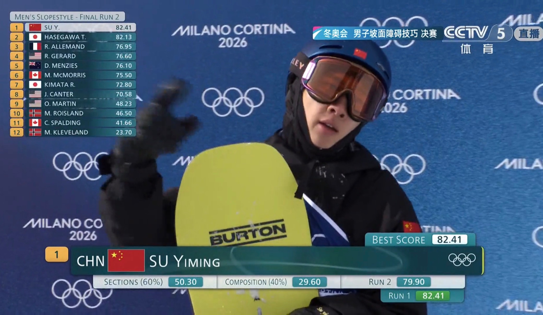 快来看坡面障碍技巧决赛,苏翊鸣第一轮82.41分,第二轮79.90分,暂列第一?
