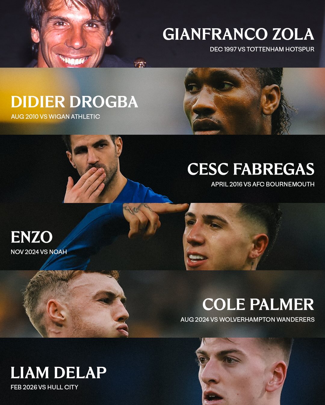 切尔西官方今日盘点英超时代达成单场3助攻这一成就的6名球员: