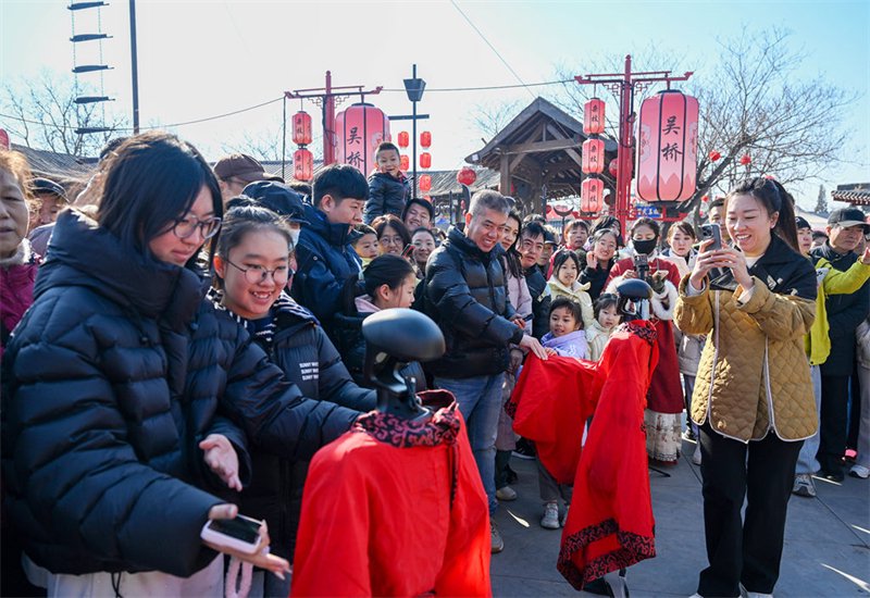 2月18日,游客在吴桥杂技大世界与表演杂技的机器人互动。