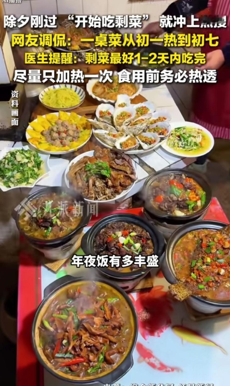 除夕刚过“开始吃剩菜”就冲上热搜,网友调侃:一桌子热菜热到初七太真实了!大年初一开始,全国多地家庭开启“剩菜循环模式”。像山东因“双数菜盘”习俗,年夜饭过剩得连吃多日;北方部分家庭除夕午间吃团年饭,晚餐热剩菜,甚至吃到初七。 每天新的旧的一起吃,顿顿都有剩菜[捂脸][捂脸][捂脸] 不过吃剩菜也得注意安全。剩的凉菜、室温放超2小时的剩菜、冷藏4天以上的剩菜,都可能有细菌繁殖,尽量别吃。吃之前要彻底加热,吃多少热多少,避免反复加热。咱过年图个热闹,但也得把健康放在心上!
