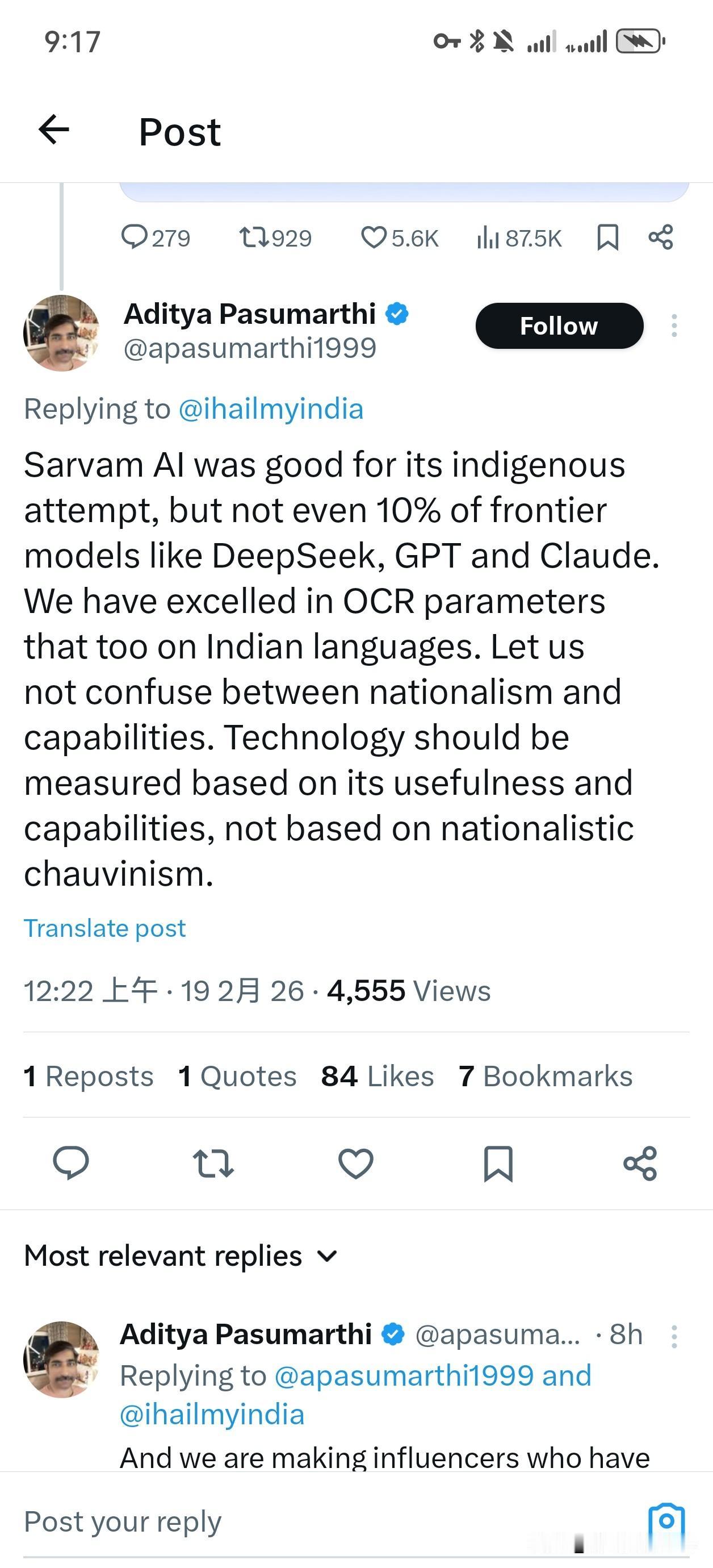 印度牛炸天的AI大模型,印度人是怎么看待的? 在印度AI峰会上,印度发布了其首个大模型Sarvam。 印度人Araadhya 表示,我真的不明白。印度确实通过 Sarvam 实现了自己的 DeepSeek,但它甚至没有像我们庆祝中国 DeepSeek 那样被庆祝 1%,尤其是当印度人利用这一成就来批评印度的时候。 同为印度人的Aditya则表示,Sarvam AI 在本土尝试方面表现出色,但连 DeepSeek、GPT 和 Claude 等前沿模型的 10%都达不到。 我们在 OCR 参数方面表现出色,在印度语言方面也是如此。 让我们不要混淆民族主义和能力。 衡量技术的标准应该是其实用性和能力,而不是民族沙文主义。 另一个印度人也表示,Sarvam 的 USP 到底是什么? 我也想为他们喝彩,但在内心深处,似乎很难相信印度的企业,因为到头来,它们不过是对某些西方倡议的廉价复制。 对此你怎么看?印度的AI大模型