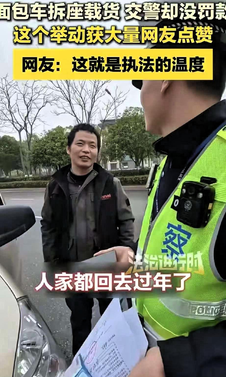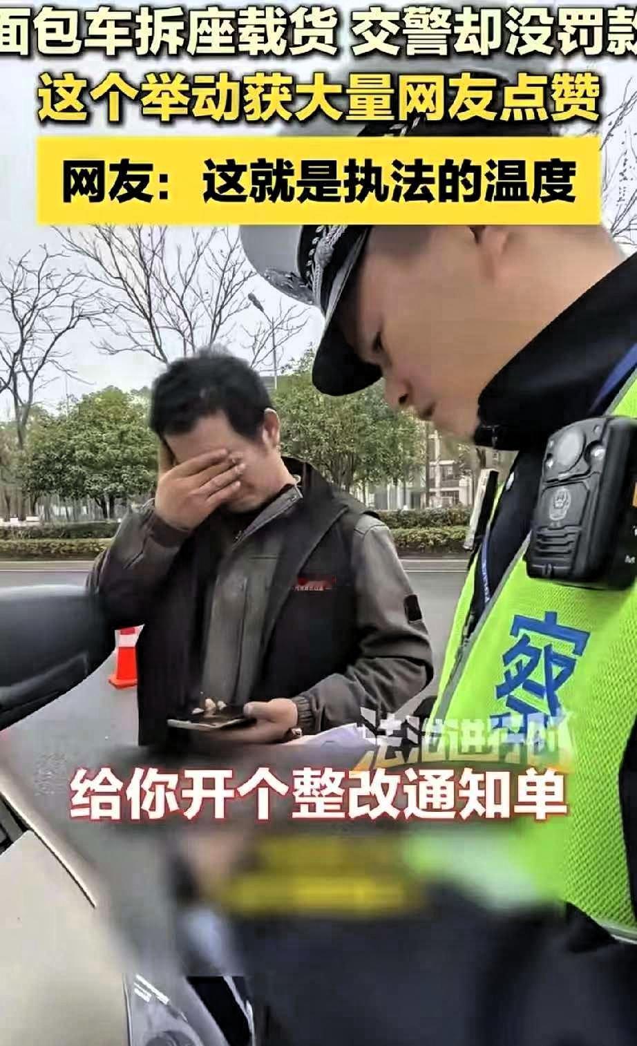 “破防了!”春节期间交警查车,遇到一辆为了多拉货拆掉座椅的面包车,驾驶员主动配合检查,态度诚恳,并向执勤人员说明自身实际困难,希望能得到酌情处理。 经了解,这名驾驶员家中有三名未成年子女需要抚养,家中老人身患重病,长期需要治疗费用。他自身没有专业技能,只能依靠货运维持全家生计,春节期间货运需求相对集中,他便加班接单,希望多增加一些收入,缓解家庭压力。 执勤交警在核实情况后,坚持依法履职,但也充分考虑当事人的实际生活困境,没有作出罚款处罚,而是依法出具整改通知书,要求其及时恢复车辆原状,消除交通违法状态,确保行车安全。随后,交警发现驾驶员尚未就餐,便将其带到执勤岗亭,为他准备了热水和食物。 这一做法,既守住了法律的底线,也体现了执法过程中的人文关怀。交通法规的初衷是保障道路安全,而非单纯处罚,执法者在刚性制度之下,保持对普通劳动者的理解与体谅,让管理更有说服力,也更贴近群众的真实生活。 生活不易,很多普通人都在默默扛起家庭的责任,努力生活。他们并非故意违反规定,只是被生活所迫,尽力寻找出路。而有温度的执法,恰恰是在规则与情理之间找到平衡,既纠正错误,又不寒人心。 一碗热饭、一次宽容的整改处理,传递的是人与人之间最朴素的善意。这样的执法方式,不仅能让当事人心服口服,也能让更多人感受到社会的温暖。 法理之外,亦有人情。这样踏实又暖心的处理方式,值得被更多人看见。