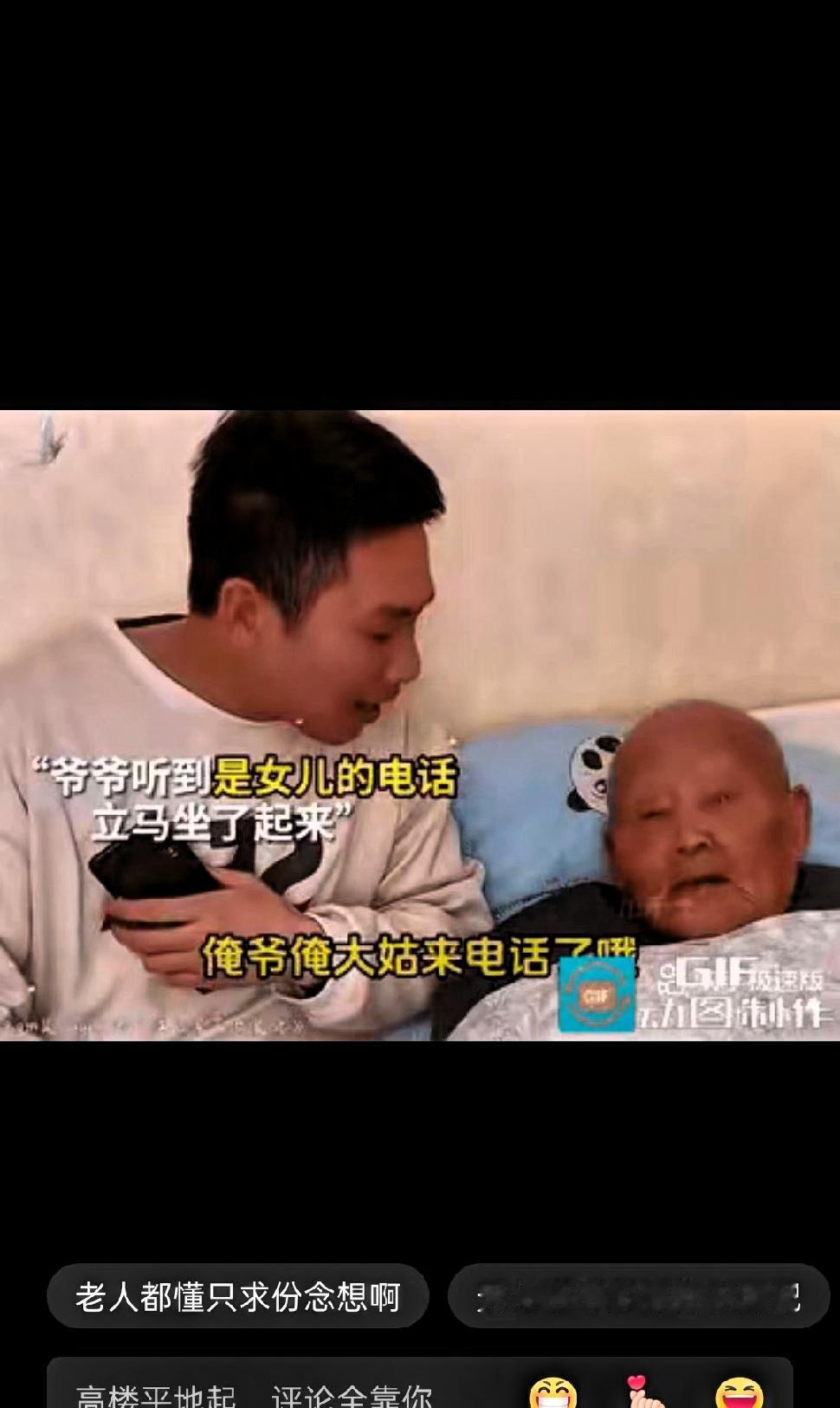 泪崩了:大年初二,91岁爷爷因为已故女儿没法回来拜年,闹着脾气不肯吃饭,怎么劝都没用。 孙子看着爷爷低落的样子,心里特别难受,实在没有别的办法,便拿起手机,假装给姑姑打了一通电话,轻声对着手机说话,告诉爷爷是姑姑来问候他了。 老人本来安静地躺着,听到是女儿的声音,立刻坐起身,小心翼翼地接过手机,轻轻喊了一声女儿的小名,说自己想她了。那语气里没有哭闹,只有藏不住的想念和一点点委屈。 孙子强忍着情绪,模仿着姑姑的语气,让爷爷好好吃饭,别让在外的人担心。爷爷听完,马上端起面前的面条,一口一口认真吃起来,生怕让女儿牵挂。可吃着吃着,眼泪就悄悄落了下来。 其实大家都明白,老人心里多半是清楚的,他只是愿意相信这个温柔的谎言。短短几分钟,能再听见一次“女儿的声音”,对他来说,就是最大的安慰。 这一幕没有激烈的情绪,却格外让人动容。父母对孩子的惦记,从来都不分年纪,哪怕自己已经九十高龄,心里最牵挂的,依然是那个早已长大的孩子。 人老了,想要的从来不多,一句问候,一声平安,一次有人惦记,就足够让他们安心。陪伴不必隆重,真心就好;关心不必华丽,常在就行。 别等到失去才懂得珍惜,有空多陪陪家里的老人,多跟他们说说话,他们的等待,其实很简单。