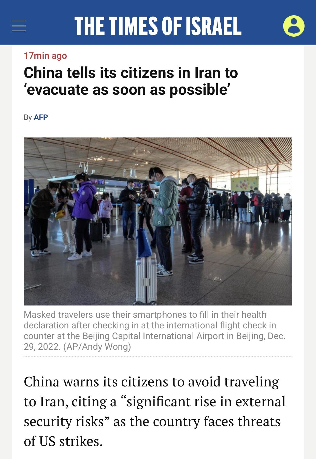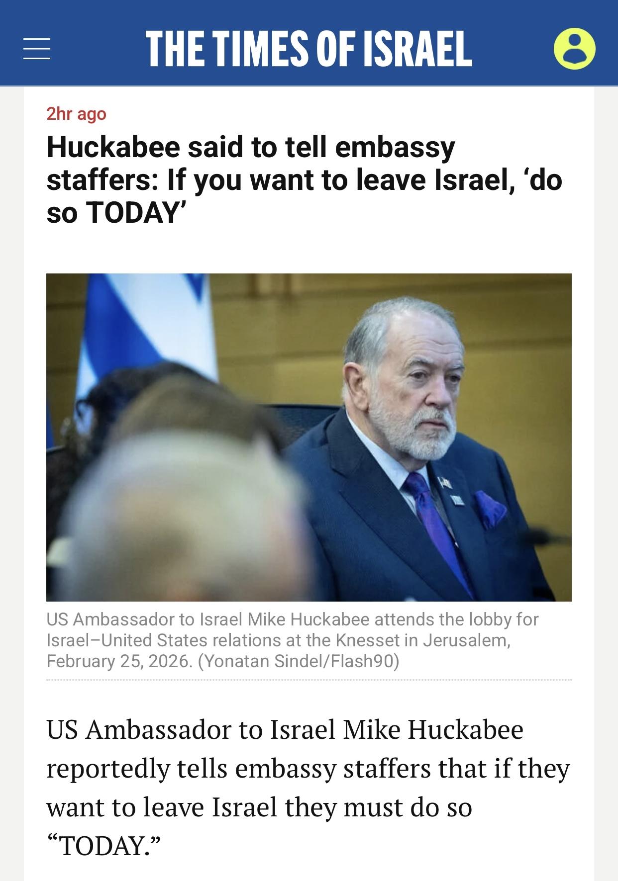 以媒:中国呼吁公民尽快离开以色列 美国大使劝公民”今天就走” 以色列《以色列时报》官网2月27日报道:据法新社(AFP)报道说,中国已警告其公民避免前往伊朗,理由是伊朗面临美国打击的威胁,“外部安全风险正显著上升”。 报道说,北京外交部在一份声明中表示:“鉴于伊朗当前的安全形势,中国外交部和中国驻伊朗大使馆及领事馆提醒中国公民暂时避免前往伊朗”,”建议目前在伊朗的中国国民加强安全预防措施,并尽快撤离”。 报道的原标题是《China tells its citizens in Iran to ‘evacuate as soon as possible’》(中国告诉其在伊朗的公民“尽快撤离”)。 另据报道:美国驻以色列大使迈克·赫卡比告诉大使馆工作人员,如果他们想离开以色列,必须“今天”就离开(US Ambassador to Israel Mike Huckabee reportedly tells embassy staffers that if they want to leave Israel they must do so “TODAY.”)。 他在当地时间今天上午10点24分发送的电子邮件中写道,如果有任何员工或家庭成员想离开,他们“应该今天离开”。 报道说,美国大使馆呼吁非紧急工作人员离开,“这很可能导致今天对飞机座位的需求大增”,赫卡比写道,“重点是要找到一个能让你继续前往华盛顿特区的座位,但首要任务是尽快离开这个国家”。 报道的原标题是《Huckabee said to tell embassy staffers: If you want to leave Israel, ‘do so TODAY’》(赫卡比说,要告诉大使馆工作人员:如果你们想离开以色列,“今天就走吧”)。