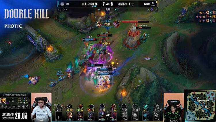 [31:31]龙魂团,Wei蒙多被打掉半血直接开大,但Zhuo妮蔻进场开两人被Photic飞机击杀,后者疯狂输出拿到双杀,iG打出0换4,经济领先7.6k。