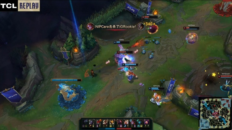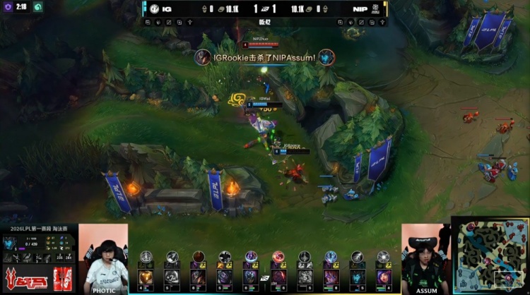 [21:29]中路团战,Photic飞机见面被Zhuo妮蔻开到睡着,Assum卡莉丝塔拿到大人头,NIP推掉iG中路一塔,经济落后2.8k。