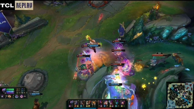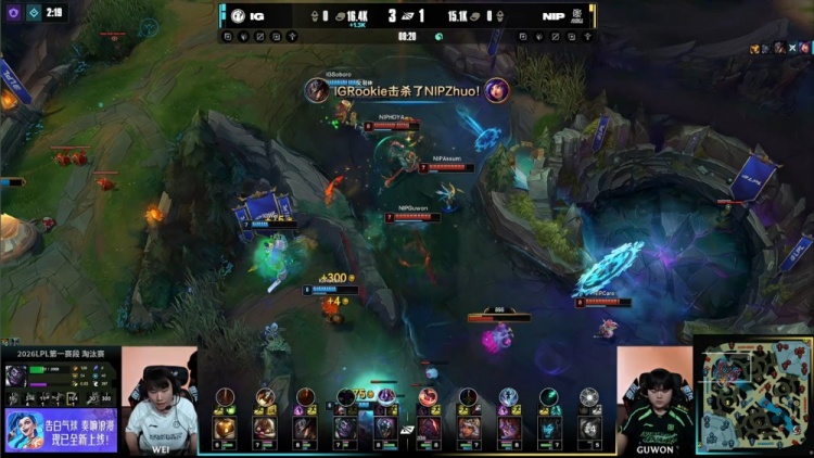 [17:54]中路团战,Zhuo妮蔻被Photic飞机poke打残,Zhuo进场开大直接被Jwei巴德击杀,Rookie卡牌黄牌定住HOYA赛恩,Guwon奇亚娜推两人被Photic飞机击杀,后者再杀Care阿萝拉拿到双杀,iG打出2换3,经济领先3.3k。