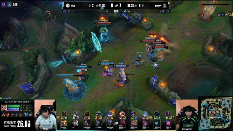 [25:05]iG入侵NIP野区,Soboro贾克斯开E闪现进人群定住NIP四人,NIP众人残血后撤,Guwon奇亚娜死在自家野区,iG回头拿到大龙,NIP四人接团,Assum卡莉丝塔开滑双杀拿到Soboro贾克斯终结人头,NIP打出0换3,经济落后3k。