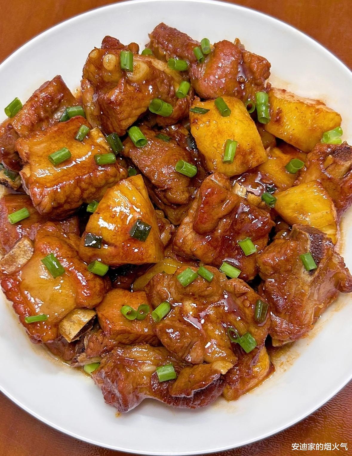 吃的时候排骨已经完全入味,外层的酱汁酸甜浓郁,咬开之后肉香很足,炖得软嫩的排骨轻轻一撕就脱骨,菠萝块经过炖煮,本身的酸涩感完全消失,吸满了肉香和酱汁的味道,吃起来酸甜爽口,配米饭简直绝配,酱汁浇在米饭上,一口气能吃两大碗。