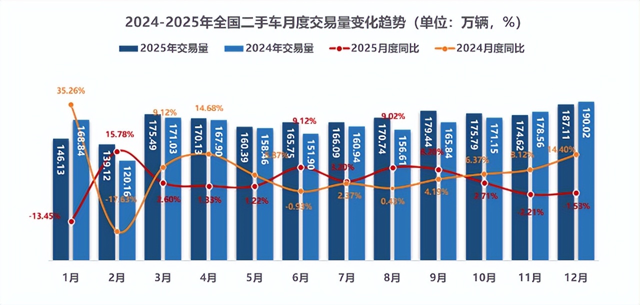 1月13日,中国汽车流通协会数据显示,2025年12月,全国二手车市场交易量187.11万辆,环比增长7.15%,同比下降1.53%,交易金额1206.72亿元。2025年二手车市场交易规模突破2000万辆大关,创历史新高。2025年1-12月,二手车累计交易量2010.80万辆,同比增长2.52%,与同期相比增加49.38万辆,累计交易金额为12897.90亿元。