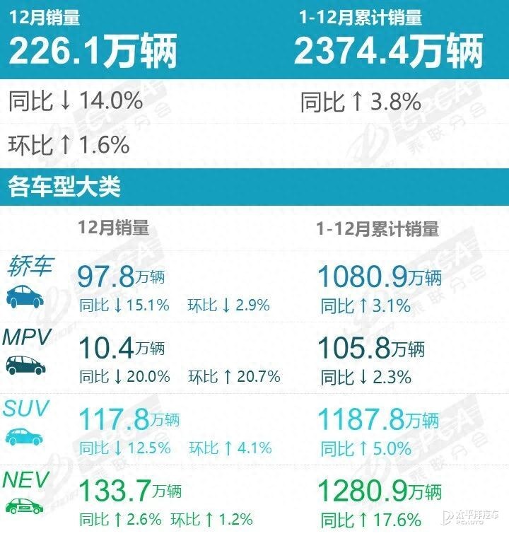 1月9日,乘联分会发布数据显示,2025年12月,全国乘用车市场零售227.6万辆,同比下降14.5%;2025年全年,全国广义乘用车零售销量为2402.4万辆,比2024年增长3.9%。其中,2025年12月,新能源乘用车国内零售销量达133.7万辆,同比增长2.6%,环比增长1.2%;2025年1-12月累计,零售1280.9万辆,同比增长17.6%。