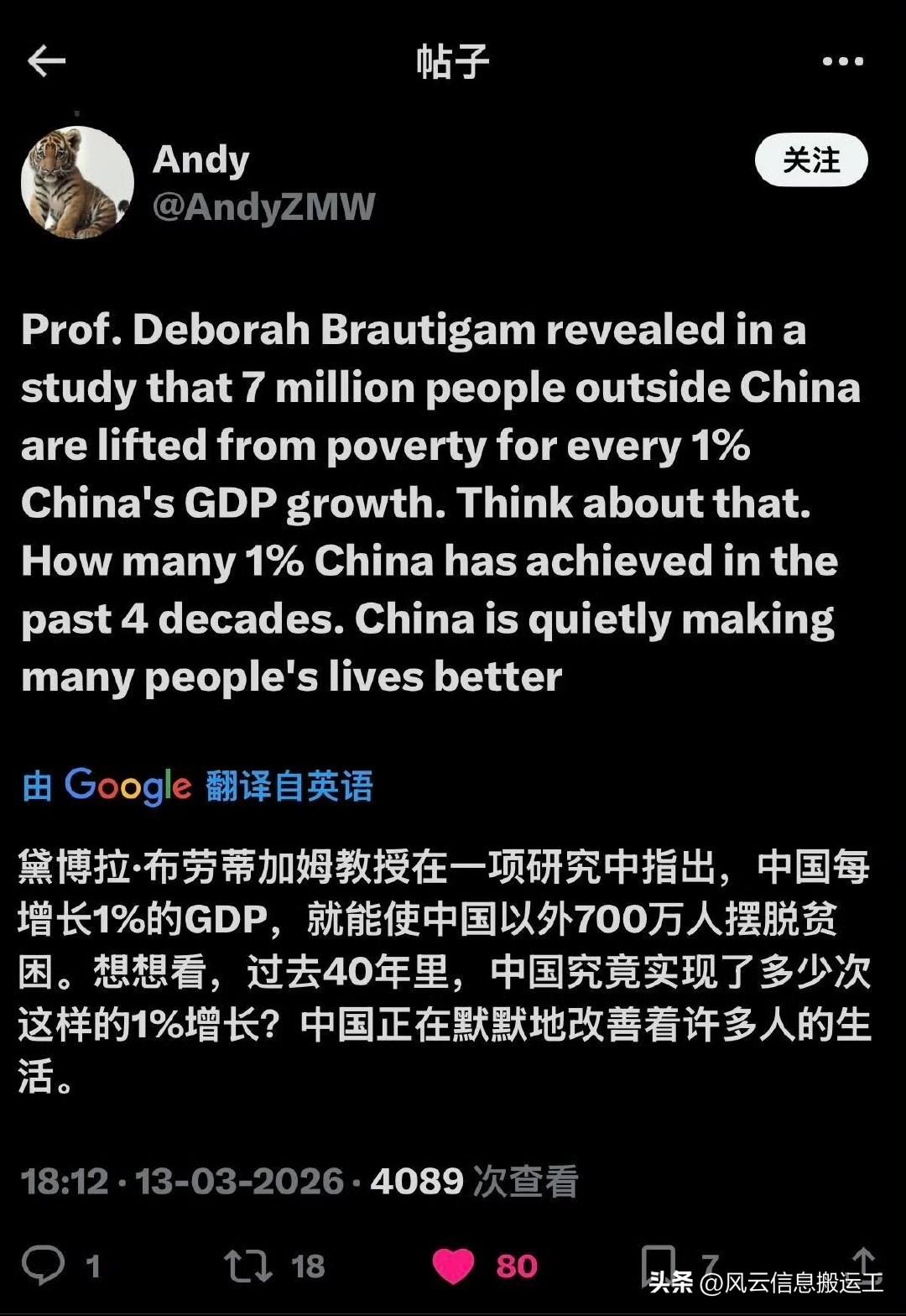 非洲网民热议中国发展给非洲和世界带来的正向作用,观点清醒又犀利: 1.中国1980至2020年的经济增长,与非洲人口增长高度正相关,本质是中国在经济与政治上的制衡,尤其苏联解体后,避免了非洲被西方彻底重新殖民,守护了至少10亿非洲人的生存根基。 2.有研究指出,中国GDP每增长1%,就能让中国以外700万人摆脱贫困,过去40年的持续增长,默默改善了包括非洲在内无数人的生活。 3.在非洲人看来,中国是打破西方“扼喉”的关键力量,让非洲大陆获得了宝贵的战略自主空间,他们清醒批判“分不清掠夺者与盟友”的历史文盲,强调中国才是替非洲“挡子弹”的一方。 4.从中国生产的物美价廉的衣服到平价电脑、新车,中国用可负担的技术与商品,推动非洲技术进步,让非洲避免停留在1960年的技术水平,实实在在支持非洲现代化。