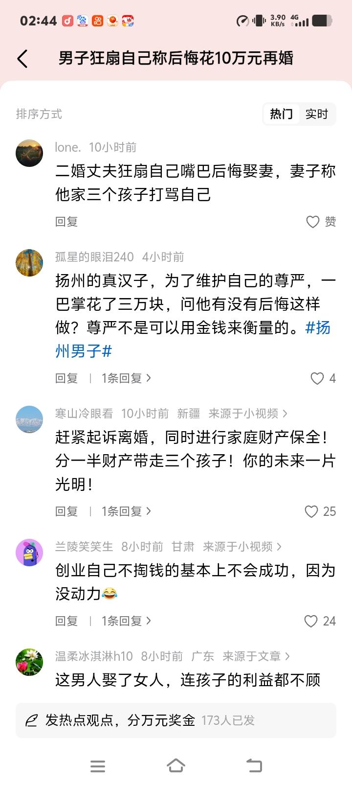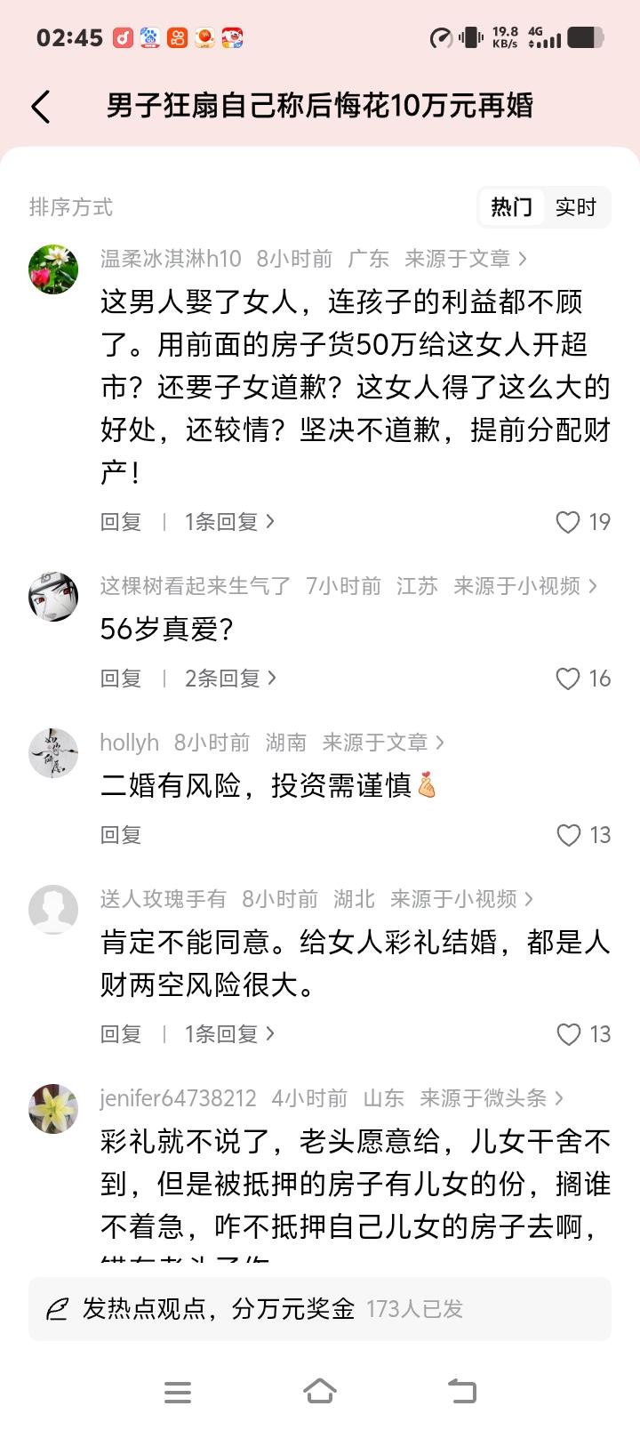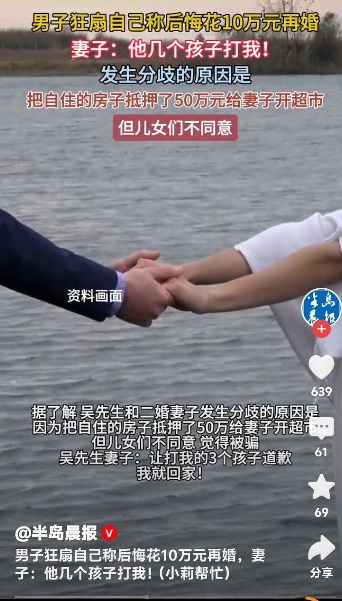河南开封56岁男子狂扇耳光悔断肠:十万彩礼+抵押房产娶二婚妻,一年后竟称“不如养条狗”!半路夫妻的钱与情到底有多扎心? 当56岁的吴先生在镜头前狠狠扇自己耳光时,他或许才真正体会到什么叫“迟来的清醒”。十万彩礼,五十万房款抵押,换来一段仅维持一年的二婚。妻子哭诉被他三个孩子打骂,自己在家“不如一条狗”。这场河南开封上演的再婚闹剧,撕开了多少重组家庭血淋淋的真相? 一边是捶胸顿足喊后悔的丈夫,一边是要求三个继子女道歉才肯回家的妻子。矛盾焦点赫然是一套被抵押的自住房——吴先生为支持妻子开超市,悄悄将房子抵押了五十万。子女们炸了锅:“爸,你被骗了!”而妻子委屈至极:“他们动手时,你为何沉默?” 重组家庭的脆弱,往往从钱开始溃败。吴先生以为十万彩礼是“万里挑一”的诚意,抵押房产是“真爱无畏”的付出。可当子女利益与新婚妻子需求碰撞时,他既没守住父亲的底线,也没担起丈夫的担当。这场婚姻里,每个人都觉得自己是受害者。 妻子那句“不如一条狗”的控诉,听得人心里发颤。二婚女性融入新家庭的艰难,远非外人能想象。当继子女的排斥遇上丈夫的回避,所谓的家就成了冰冷的战场。她要的或许不是那声道歉,而是被正视、被保护的尊严。 而三个子女的愤怒,又何尝不是一种恐慌?父亲将安身立命的房子抵押给毫无血缘关系的继母,他们怕的不是钱,是父亲晚年失据、亲情流离的未来。中国式家庭里,财产从来不只是钱,更是安全感与情感的载体。 网友吵翻了天。有人说“老了就别再婚,逍遥自在不好吗”,有人叹“二婚都是各取所需”。可我们批判的,真是婚姻本身吗?不,是那些在孤独驱使下草率的决定,是在情感裹挟中失去的理性,是缺乏边界感的付出与索取。 吴先生扇向自己的耳光,应该打醒多少类似处境的人?半路夫妻不是不能幸福,但幸福的前提是清晰的边界、坦诚的沟通,以及比初婚更谨慎的智慧。财产要分明,子女需安抚,角色得摆正。否则,所谓的“真爱”,不过是一场代价高昂的幻觉。 如今吴先生已同意让孩子道歉,但裂痕真的能弥补吗?这场婚姻的结局尚未可知,可它留给我们的思考却无比真实:无论年龄几何,情感不能替代理智,冲动永远赢不了经营。人生的下半场,我们要的不是雪中送炭的救赎,而是锦上添花的清醒。 (来源:根据红星新闻、半岛晨报、小莉帮忙及多家媒体报道综合整理) 二婚现实 家庭财产