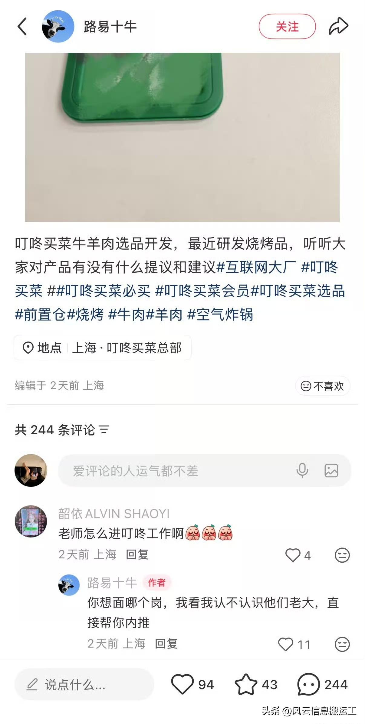 有时候在小红薯刷到叮咚买菜相关,评论区大概率会有这个产品的研发来回答问题,员工出现概率非常高,而且会说人话,比如图上 而且是个人账户,愿意在工作之外的时间和身份来回答