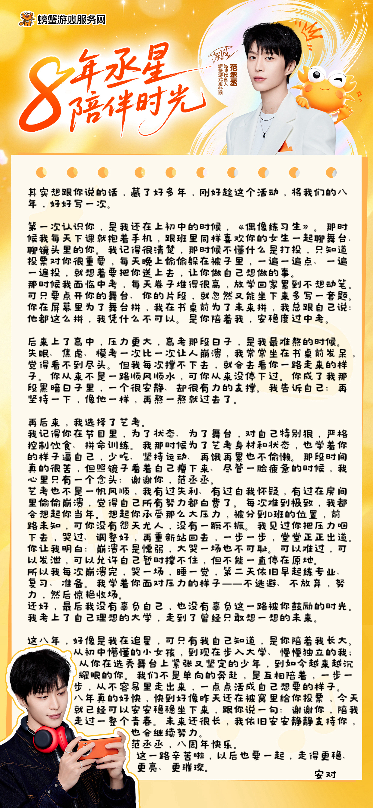 丞星在8周年故事里写的这段话,不知道能引起多少追星姐妹的共鸣!!从为他加油鼓气,到自己也冲着目标努力拼搏,一句“他在舞台上拼,我在书桌前也要拼”,真的忽然让人发觉,追星的意义不是追到他更亮,而是跟着他一起把自己的人生走稳,这才是八年之间最珍贵的东西。4.6-4.12这几天,家人们可以一起在🧣、🍠、🎵带话题发布与丞丞的8年故事,螃蟹账号为大家准备了惊喜福利,一共会有66篇内容被筛选并印成《丞星时光合集》,在丞丞生日那天将内容转交给他!还会为入选的丞星送上8周年限定盲盒隐藏卡,4.17就会在站内公示名单,千万别错过!同时这几天还有100%得奖的抽奖活动,参与道具充值活动即可获取机会!其中包含范丞丞亲签、8周年限定盲盒小卡(含隐藏卡)、范丞丞周边;甚至做任务攒够120积分,还能直接兑换8周年限定盲盒隐藏卡!这个8周年,我们都不留遗憾!上螃蟹共赴八年之约 螃蟹账号丞星嘴替 上螃蟹买道具充值抽范丞丞八周年限定 范丞丞出道8周年营业 范丞丞