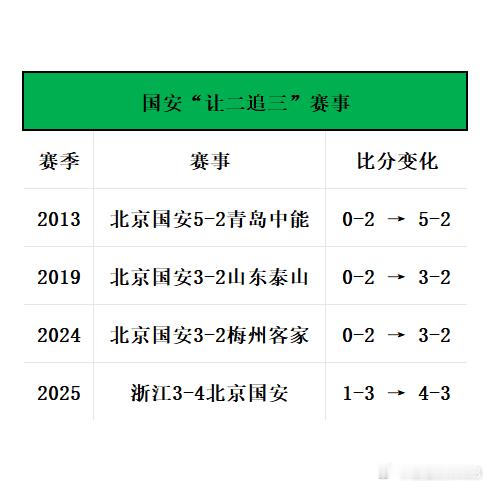 🥶【两队交战相关冷数据】国安此前客场对阵浙江队有4次落败,主场负于对手却有5次,罕见地出现主场负于对手的次数多于客场的情况。上赛季第二回合交锋,国安在1-3落后的情况下最终4-3反超比分获胜,这是国安队史首次在客场2球落后却最终逆转取胜。【图8】📊国安“让二追三”赛事。·