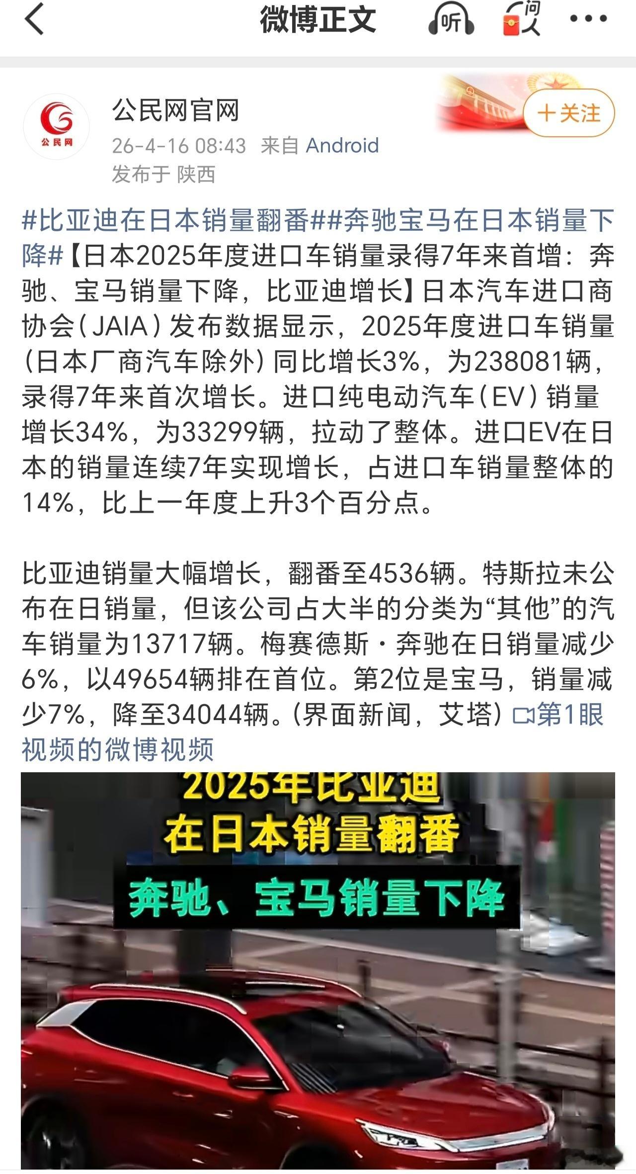 看到一组数据,我觉得十分有意义!根据日本汽车进口商协会(JAIA)最新数据,2026年3月,比亚迪在日本市场上牌量达625台,同比接近翻倍。2026年第一季度整体销量同比增幅超过100%,实现“翻番式”增长。