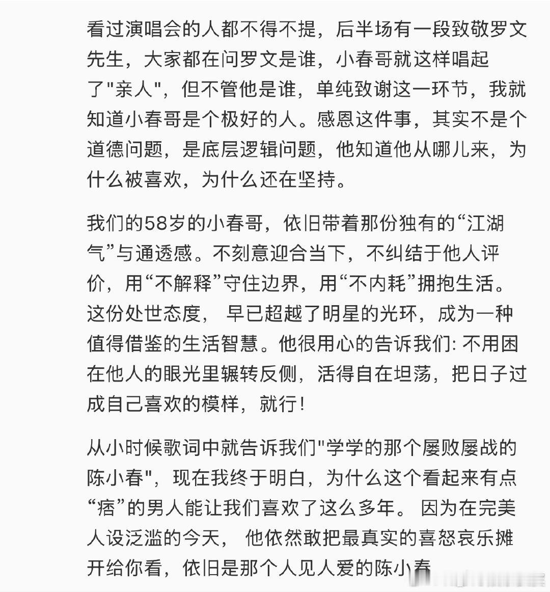 谈谈为什么要看陈小春演唱会 58 岁依旧专业在线,全程用心对待每一位观众,没有敷衍没有划水。他像身边熟悉的老友。希望二巡更好!陈小春演唱会反响 (