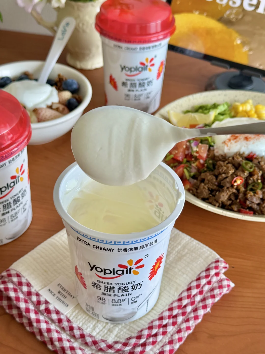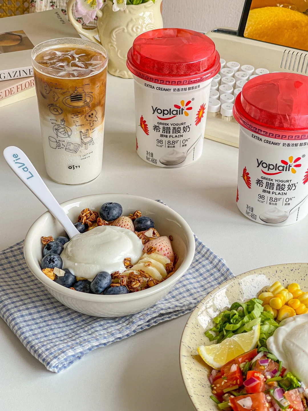 最近超喜欢做沙拉碗 优诺希腊酸奶简直是我的本命酸奶✨质地真的太绝了 3倍生牛乳浓缩工艺 挖起来像慕斯一样绵密 入口超丝滑 完全不是那种干巴巴的口感 奶香巨浓郁~拌水果 做沙拉碗都巨合适!