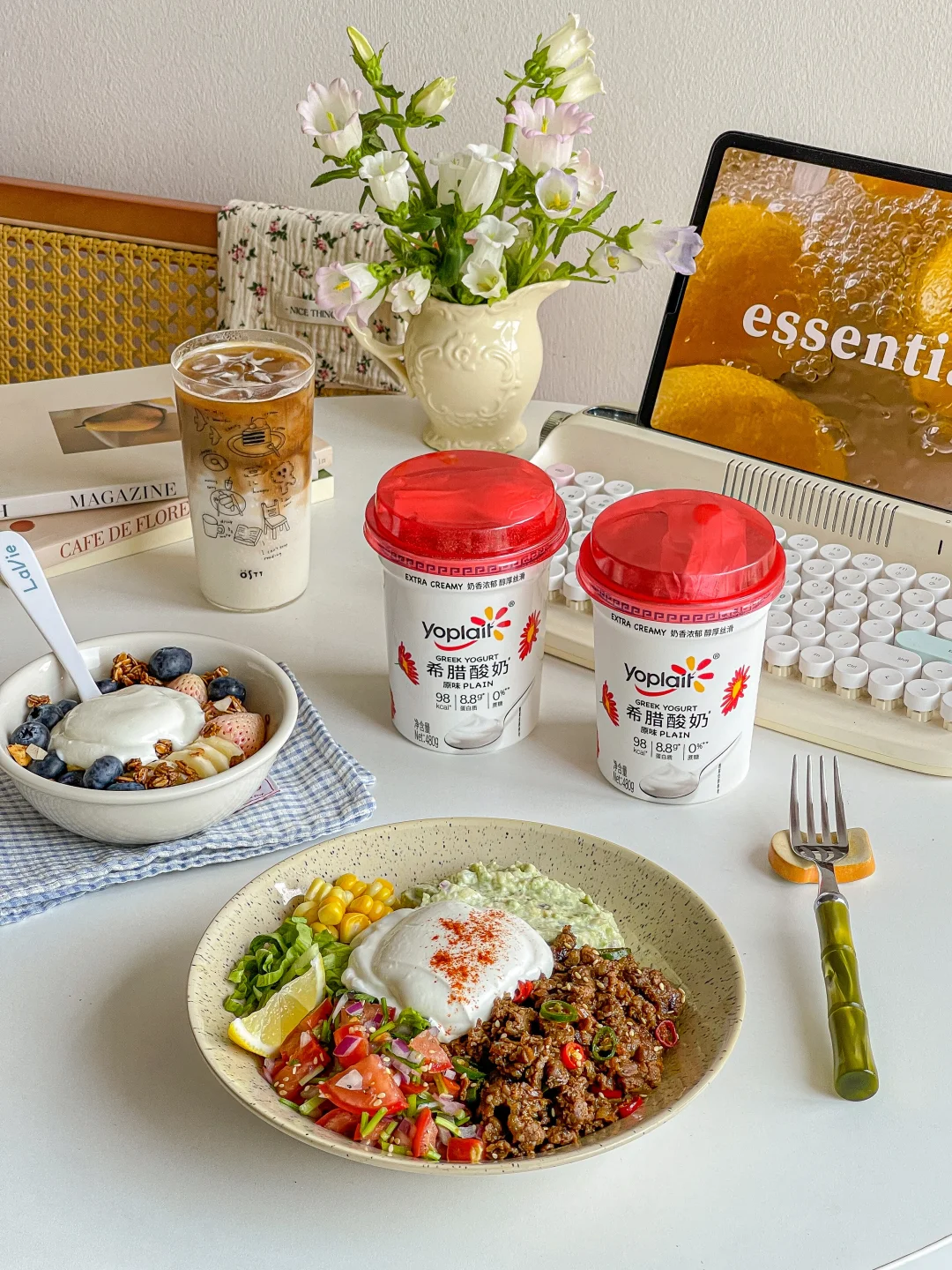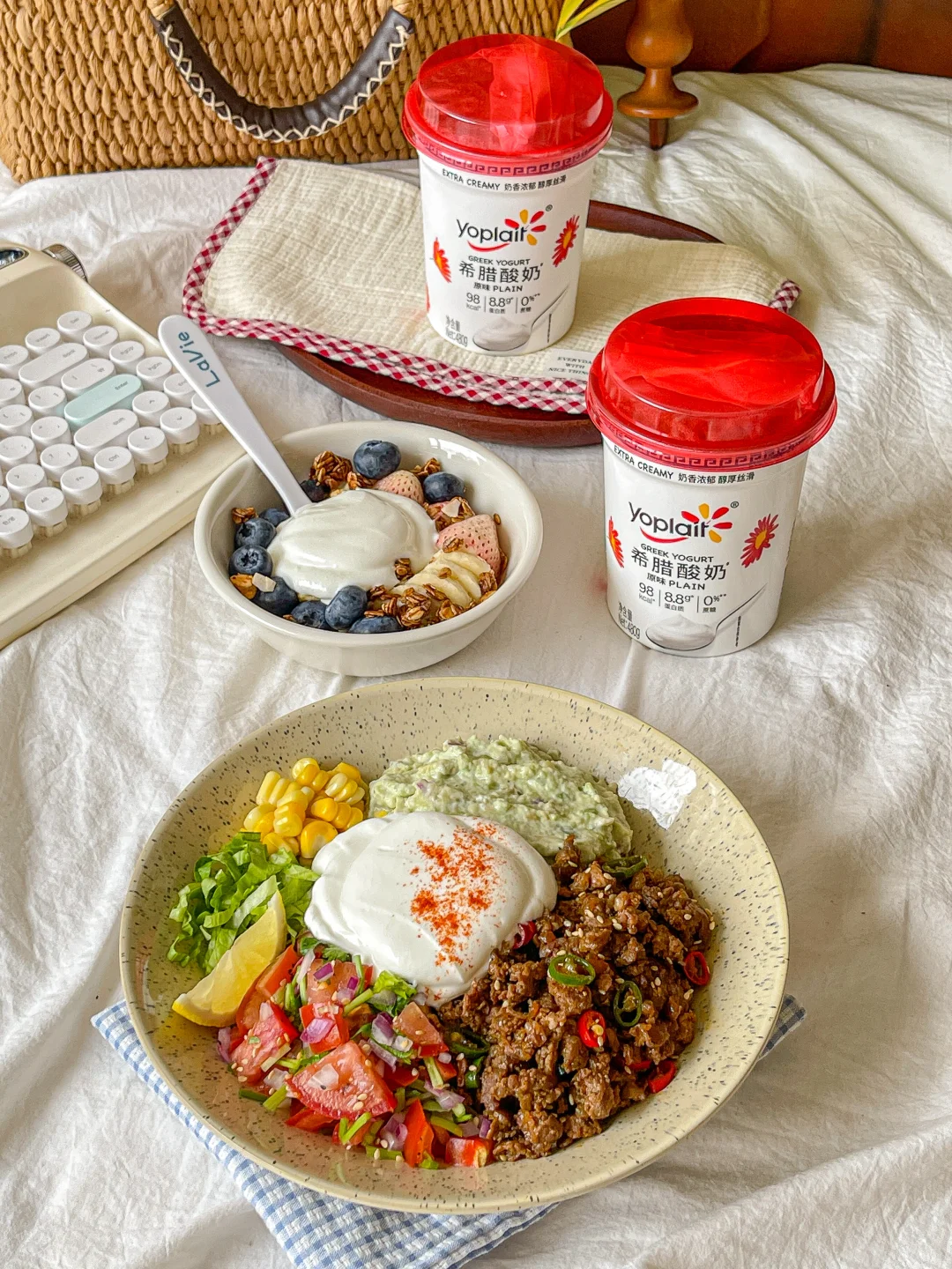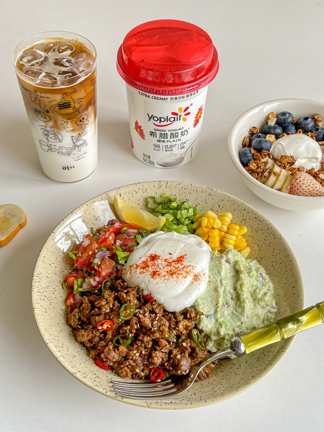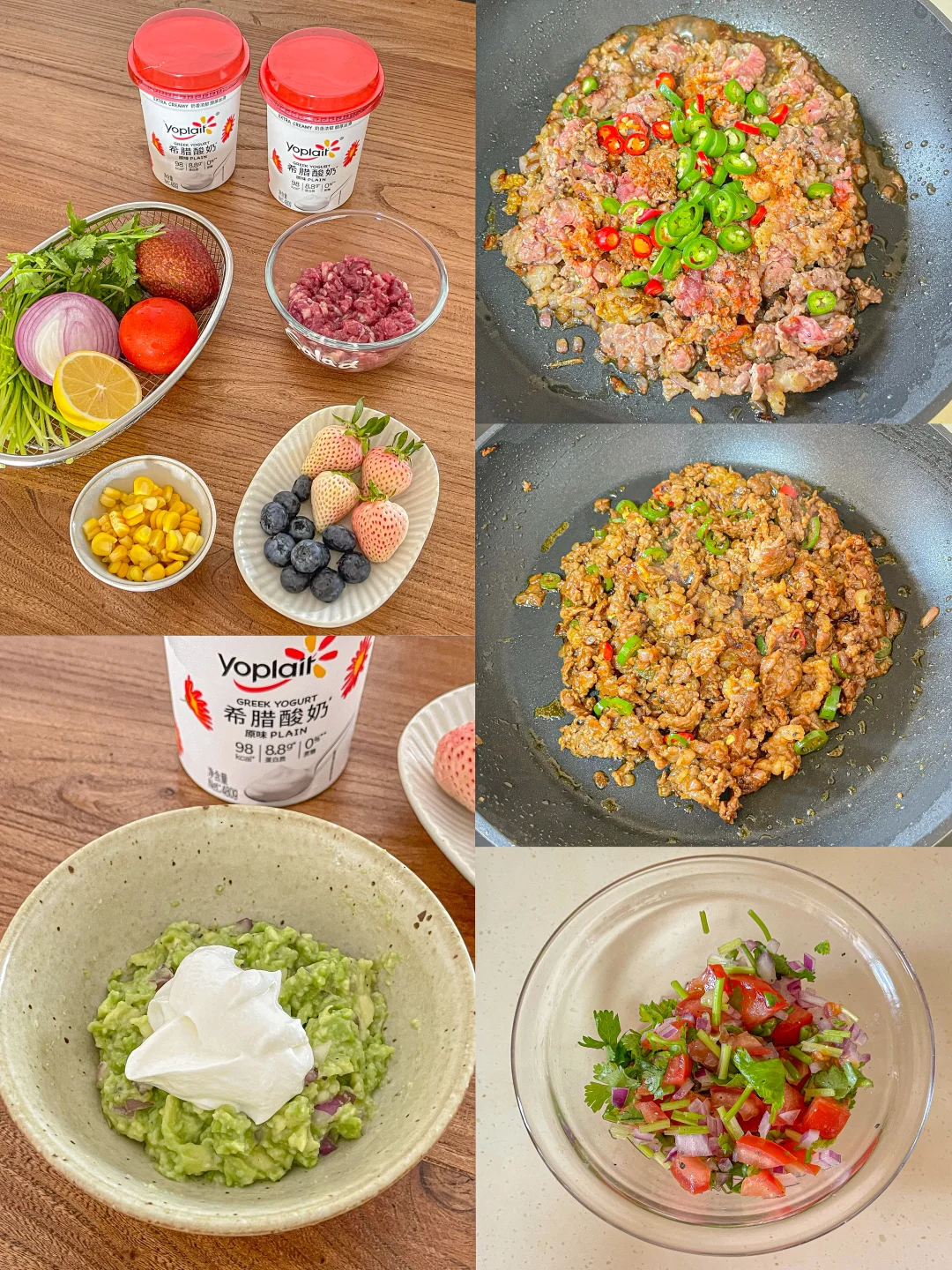 优诺希腊酸奶➕草莓➕蓝莓➕香蕉牛油果➕牛肉➕青红椒➕西红柿➕香菜➕玉米➕洋葱➕柠檬