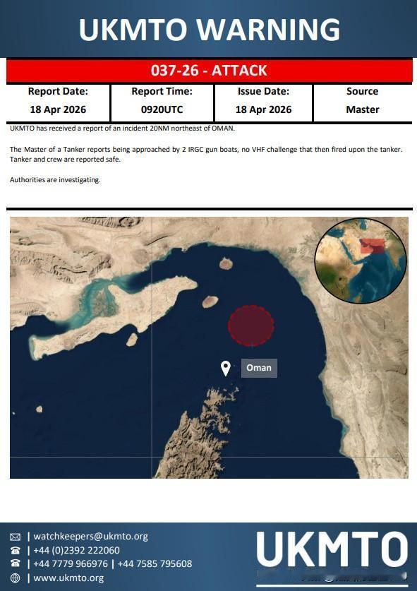 该袭击事件发生在阿曼东北20海里处。英国海事贸易行动处也补充说明,遭到袭击的油轮和船上的船员均安全。