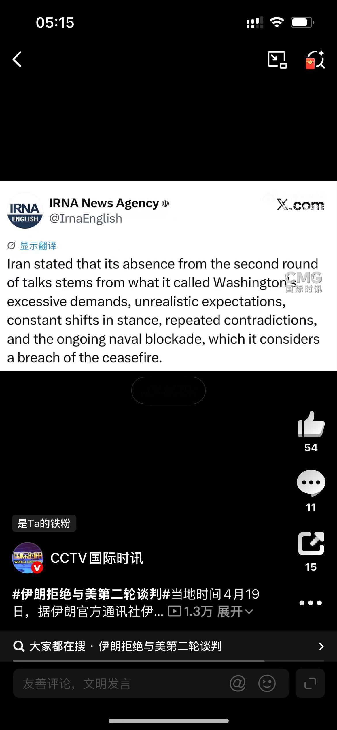 伊通社指出,伊朗拒绝谈判的原因是“美方提出过分要求、抱有不切实际的期望、立场反复无常且自相矛盾,还有持续的海上封锁”。