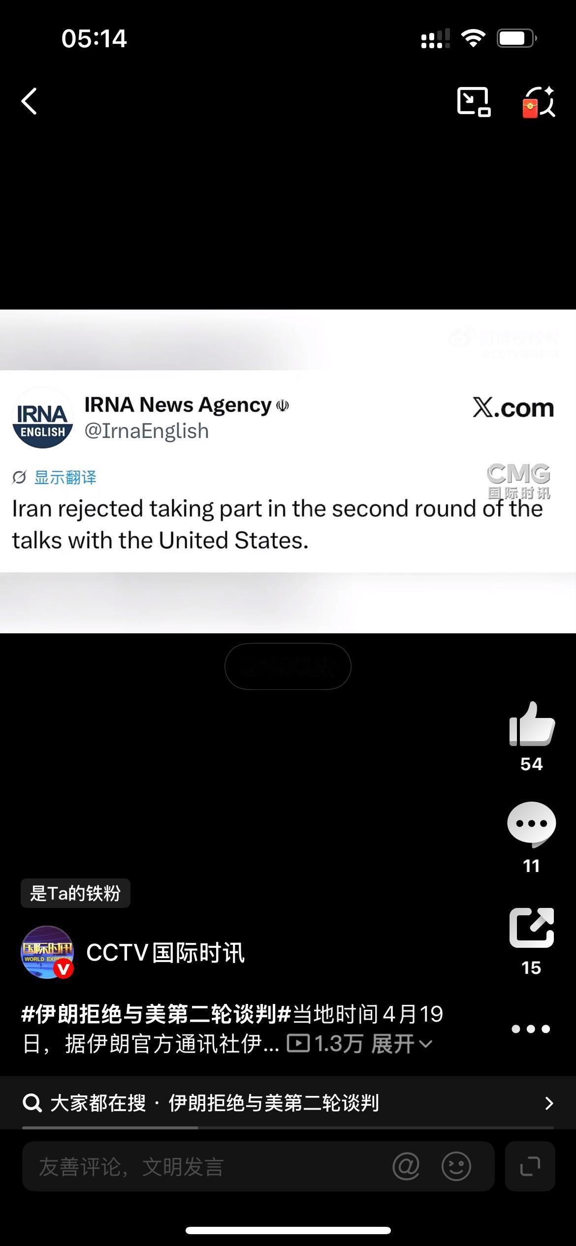 当地时间4月19日,伊朗官方通讯社伊通社报道称,伊朗已拒绝与美国举行第二轮谈判。