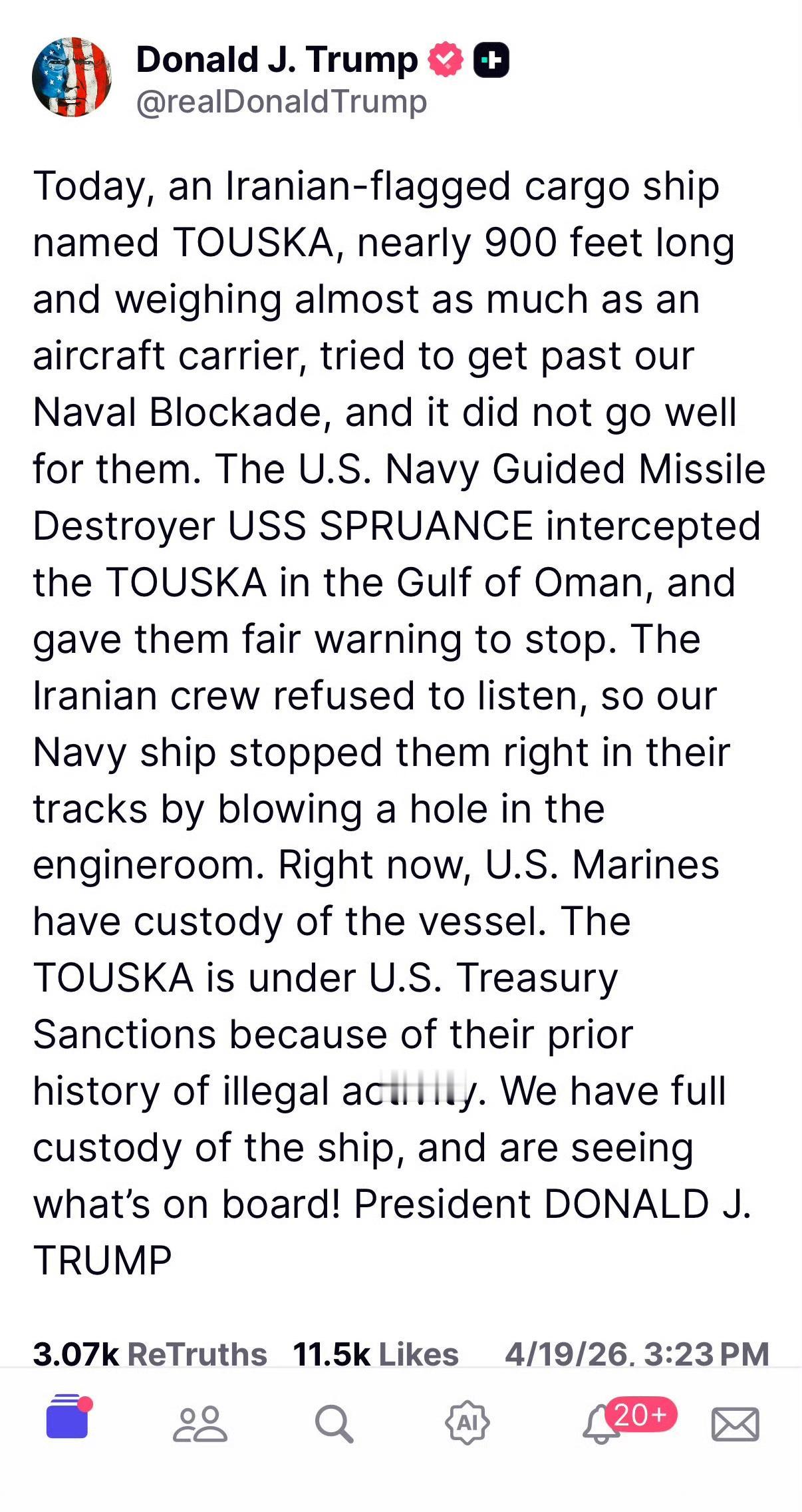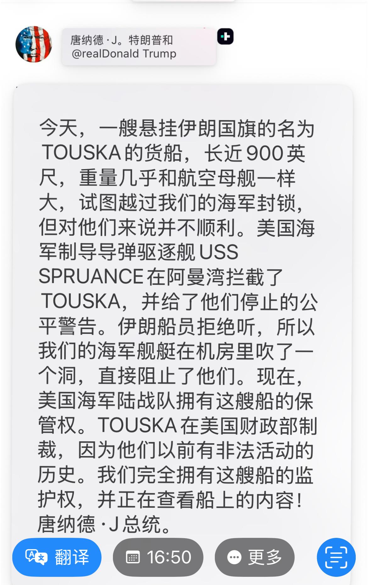 当日早些时候,特朗普在社交平台发文称,美军导弹驱逐舰在阿曼湾拦截试图突破美方海上封锁的伊朗货船“TOUSKA”,并向其开火击穿机舱,迫使船只停航,美海军陆战队已登船控制该船。