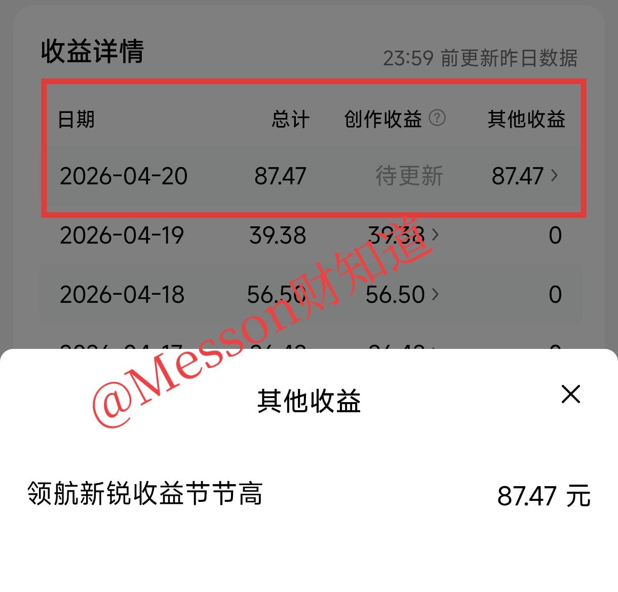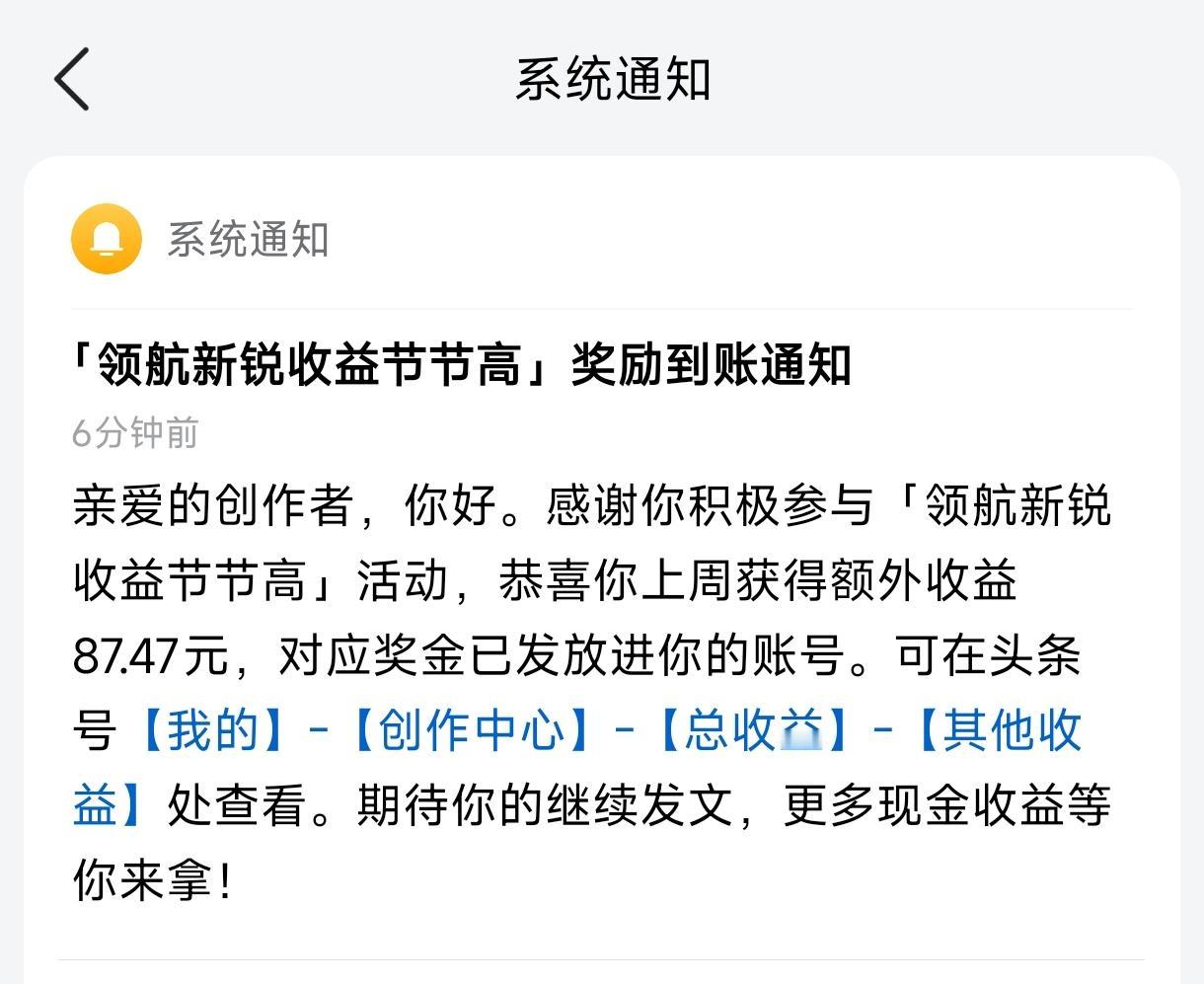 上一周的领航新锐收益节节高活动收益到账了,又是不到100块的一周,这笔额外收益是87.47元。上一周的阅读量应该是18万~20万,其中得益于一篇微头条的阅读量就有8万,但是首发文章的收益不行,所以用于额外收益翻倍的基础收益不够100块。
