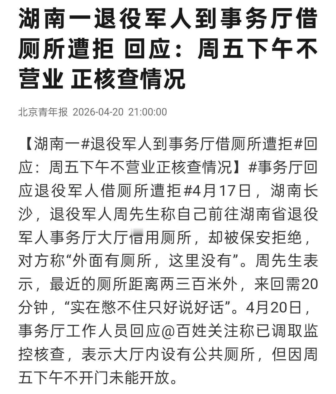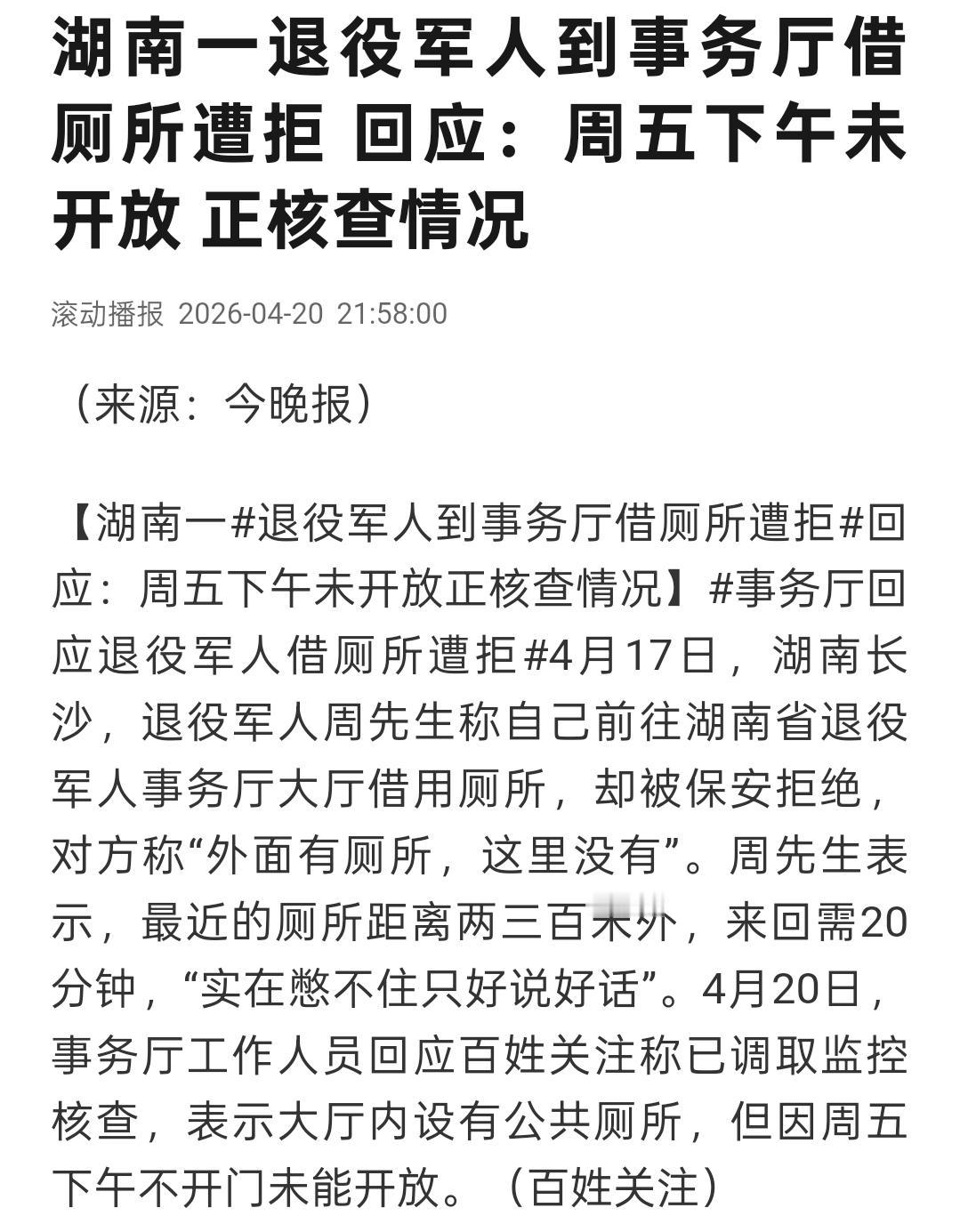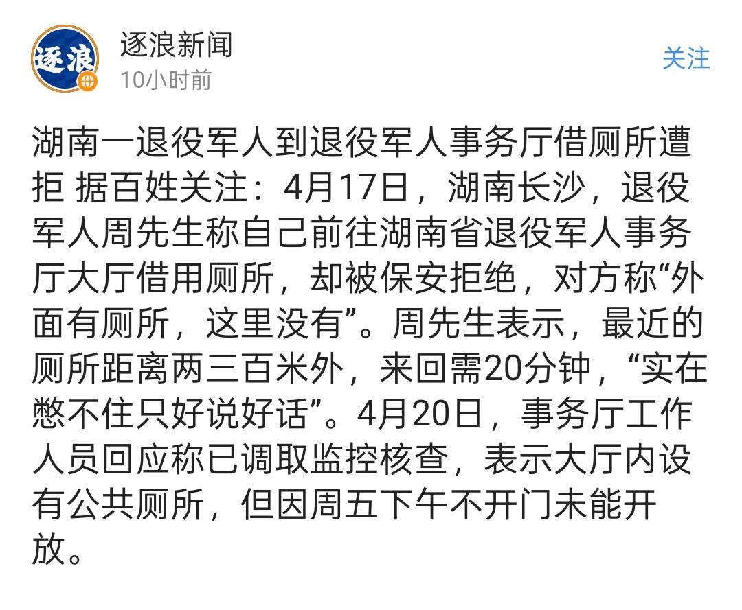 4月17号,湖南长沙,周先生腿脚不方便,拄着拐杖走到省退役军人事务厅门口。就想着借个厕所应急,人之常情吧?