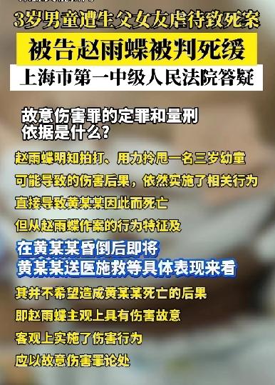 2026年4月21日,上海一起令人痛心的虐童案终于迎来了宣判。3岁男童黄某某(化名“澈澈”)被生父女友赵雨蝶虐待致死,上海市第一中级人民法院对被告人赵雨蝶以虐待罪判处有期徒刑二年,以故意伤害罪判处死刑、缓期二年执行,决定执行死刑、缓期二年执行。这起案件从案发到宣判,牵动了无数人的心。