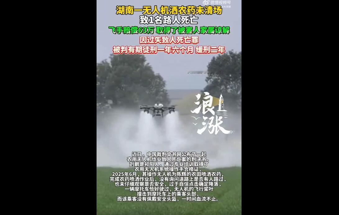 近日,中国裁判文书网公布一起农用无人机作业致人死亡案判决书,飞手刘鹏受种田大户陈辉邀请,在祁阳市八宝镇操作无人机为水稻洒农药。