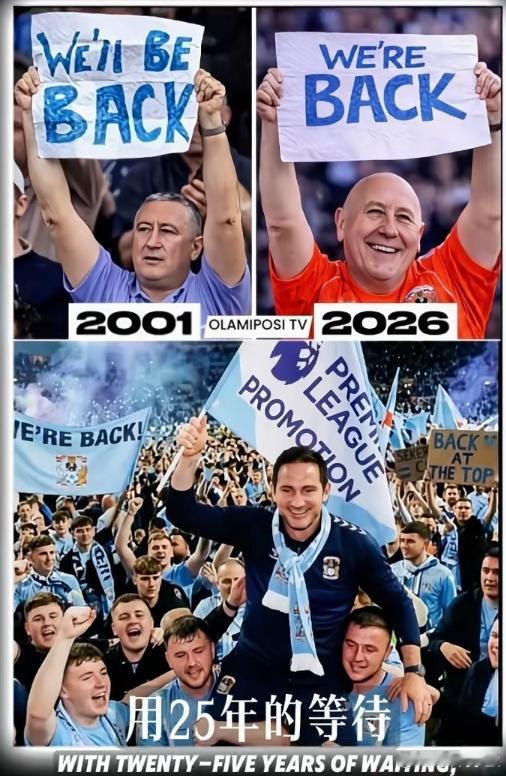4月17日,主教练兰帕德率领考文垂队提前锁定升级资格,时隔25年重返英超,两张考文垂球迷的照片感动了整个足球世界。有时候,足球最动人的时刻不是夺冠,也不是绝杀,而是一张纸板。从“我们会回来”到“我们回来了”,考文垂球迷用25年守候,让我看到了有些承诺,值得用一辈子去兑现。