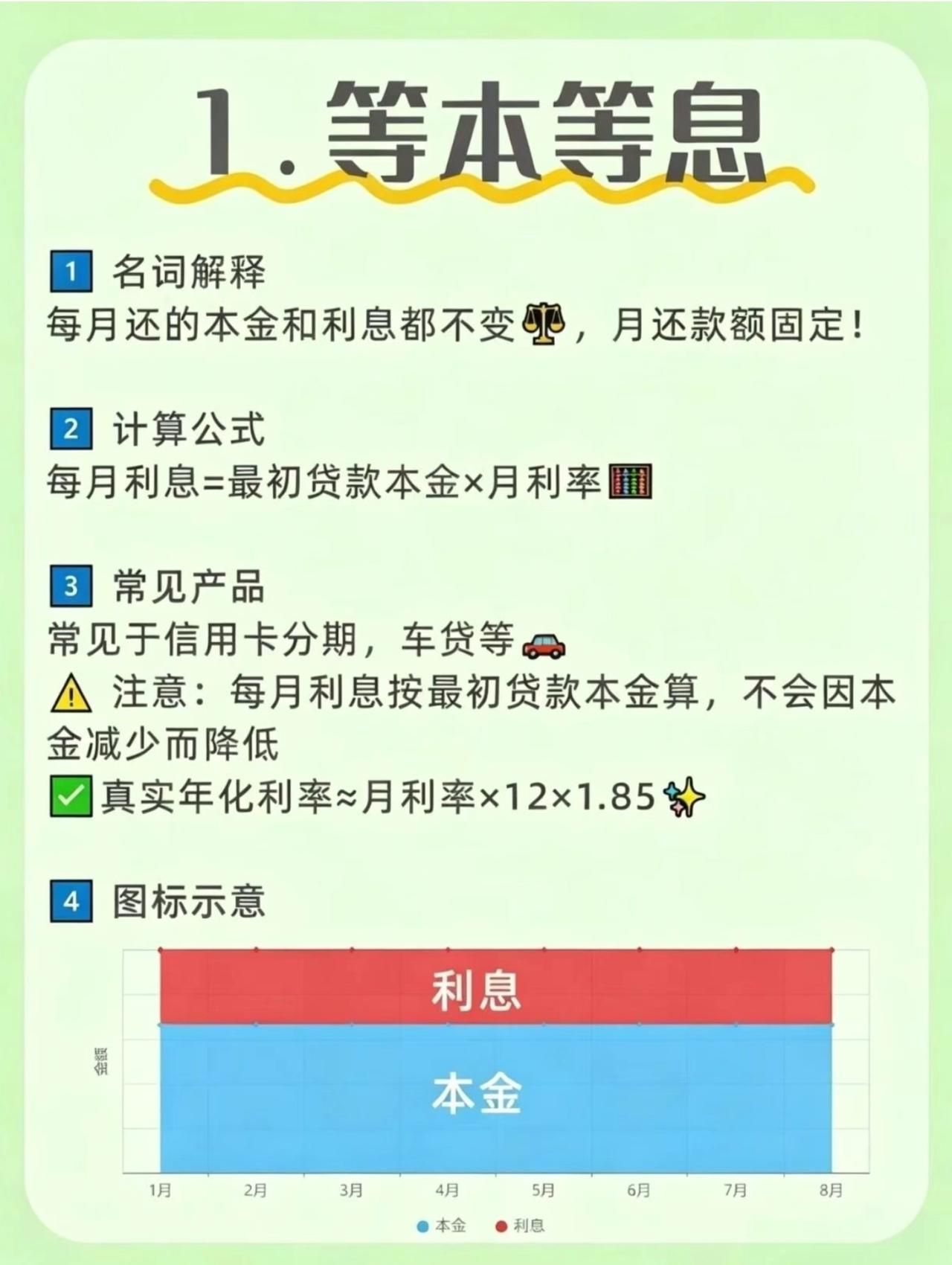 第一种等本等息,看着每月还的钱一样,其实利息一直按最初本金算,真实利率特别高,信用卡分期常用,小额短期还行,长期用的话就是坑。