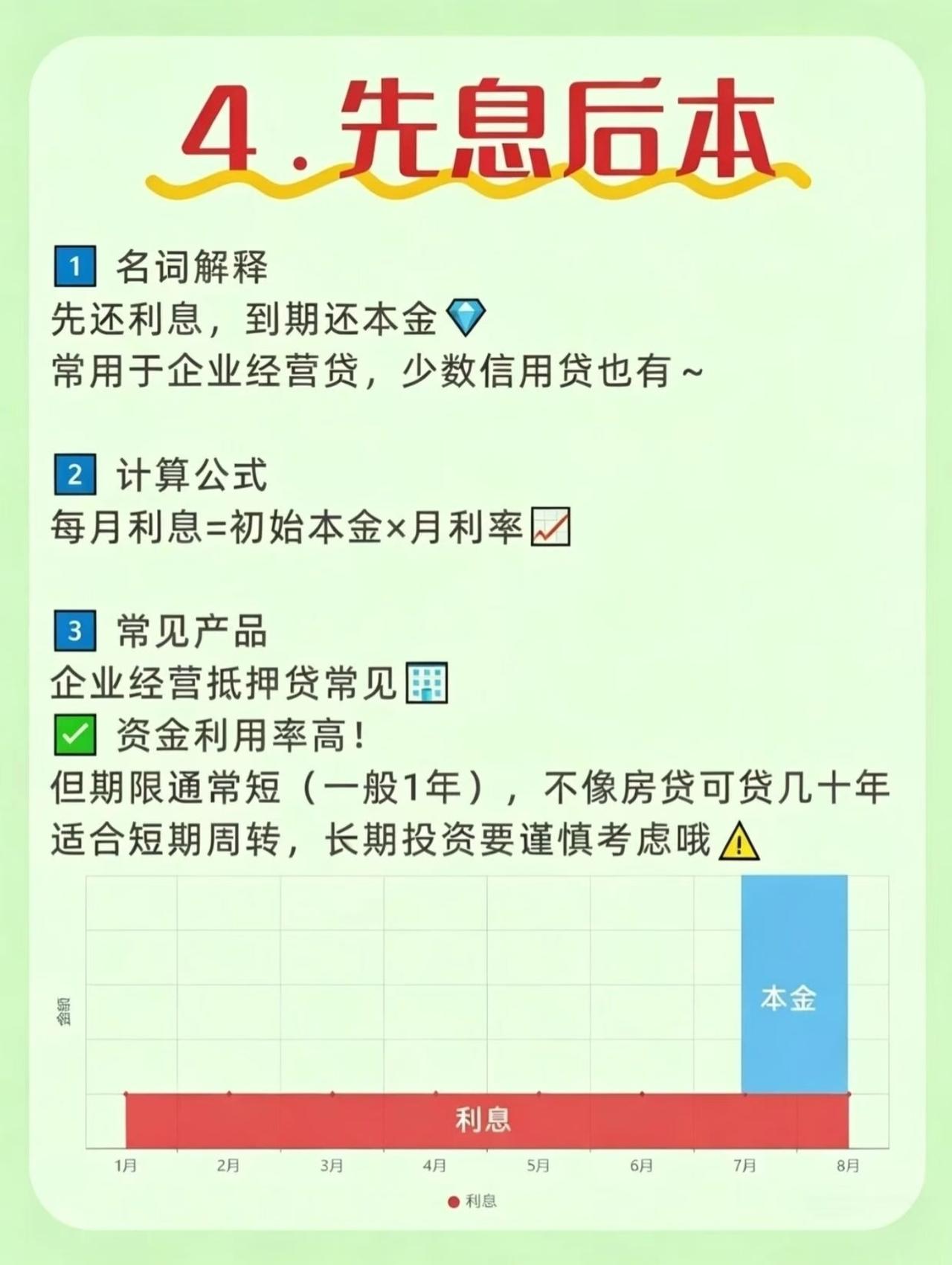 第四种先息后本,每月只还利息,到期一次性还本金,适合做生意短期周转,但到期还本压力大,千万别用来买房。