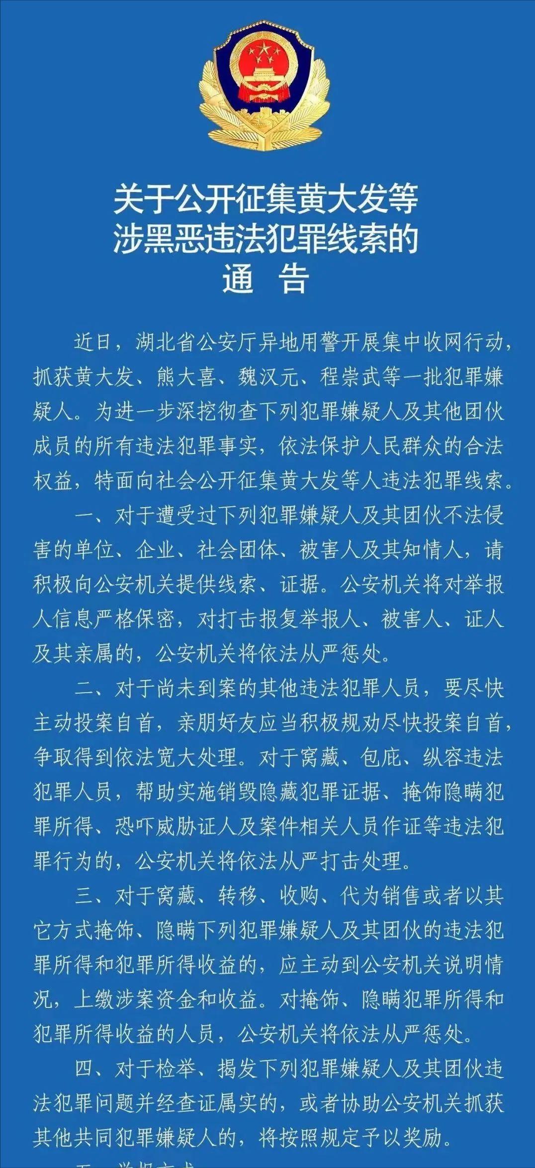 2023年5月6日,黄冈市公安局发布公告,公开征集黄大发团伙违法犯罪线索,黄大发被抓的消息得以披露。