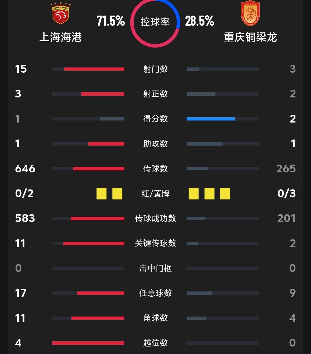 重庆铜梁龙客场2:1击败卫冕冠军上海海港,看了赛后统计数据,几乎所有数据上海海港都是领先,尤其是控球率和传球次数都是压倒性领先,重庆铜梁龙也有压倒性领先的数据就是解围,重庆铜梁龙全场39次解围,是上海海港6次的接近7倍,充分说明重庆铜梁龙抗击打能力太强了,虽然重庆铜梁龙后卫也有失误,但是你想攻破他们球门还真的很难!