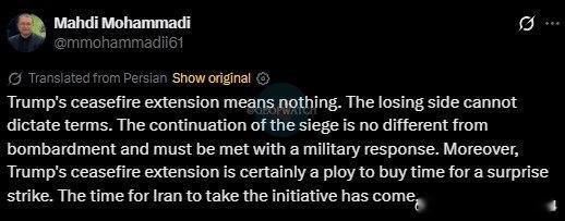 加利巴夫的私人顾问称川普的停火延长“是一场为突然打击争取时间的诡计”,并表示“伊朗主动出击的时刻已经到来。”“失败的一方不能主导条件。围困的持续必须以军事回应来面对。”