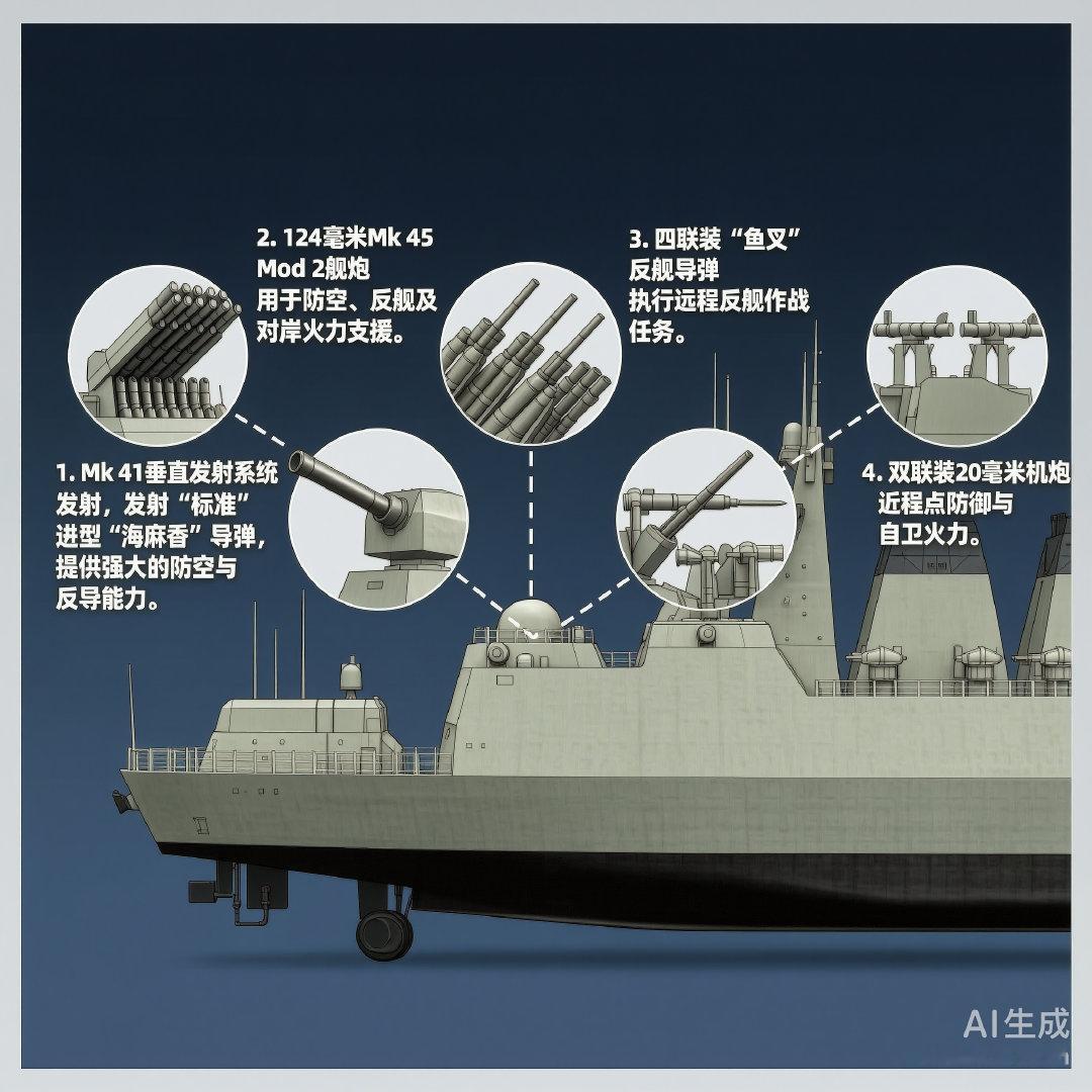 武器装备:1座四十八联装Mk 41垂直发射系统、2座四联装“鱼叉”反舰导弹发射装置、1门127毫米Mk 45 Mod 2舰炮、2座双联装Mk 32鱼雷发射装置、2门20毫米机炮。