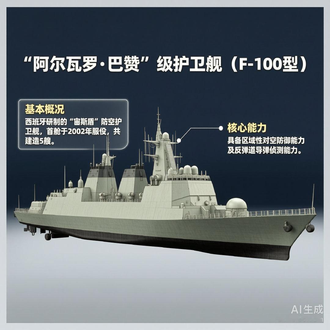 “阿尔瓦罗·巴赞”级护卫舰是西班牙研制的“宙斯盾”护卫舰,又称F-100型护卫舰,一共建造了5艘,2002年开始服役。