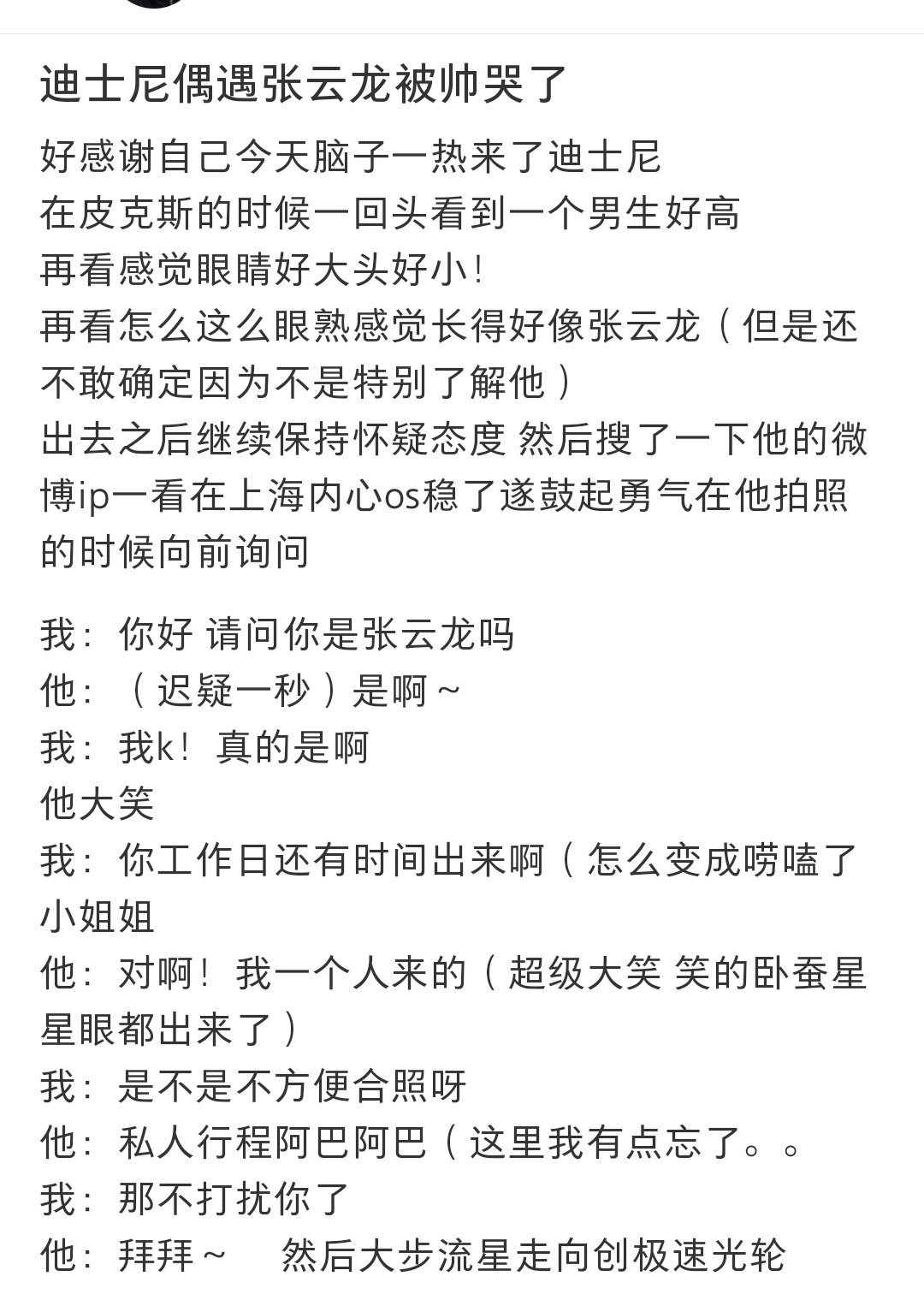 迪士尼偶遇张云龙上海迪士尼偶遇张云龙 有网友在迪士尼偶遇了一个人游玩的张云龙!还聊了几句!不敢想这个张云龙线下得多帅!