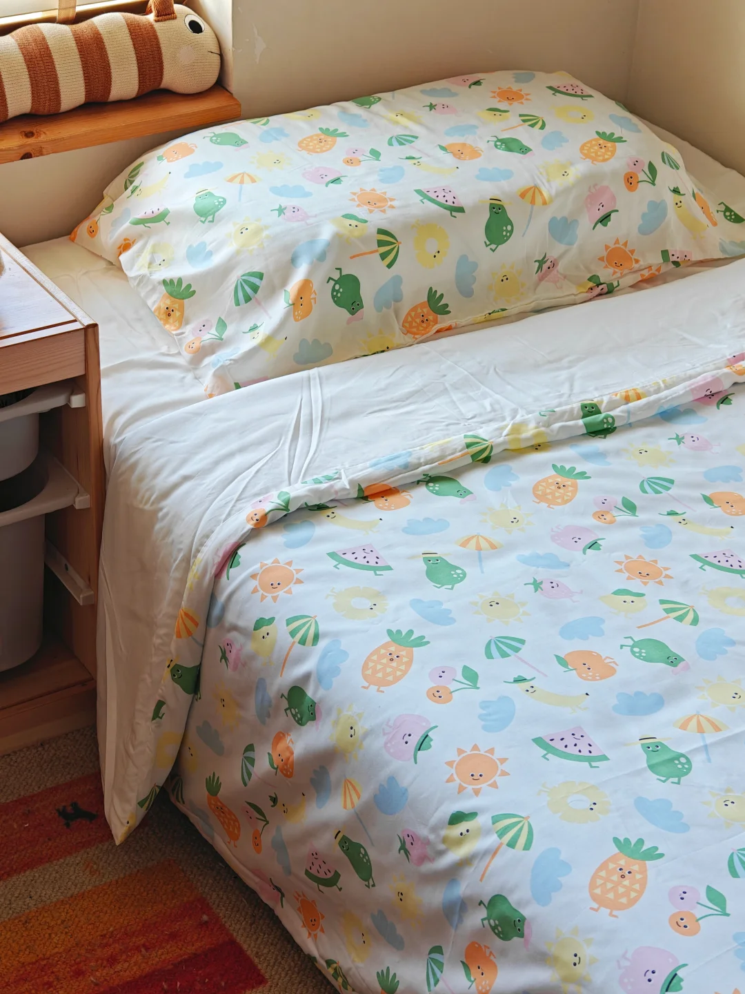 我家儿童房有很多宜家的产品,小家伙的三件套也换上了。