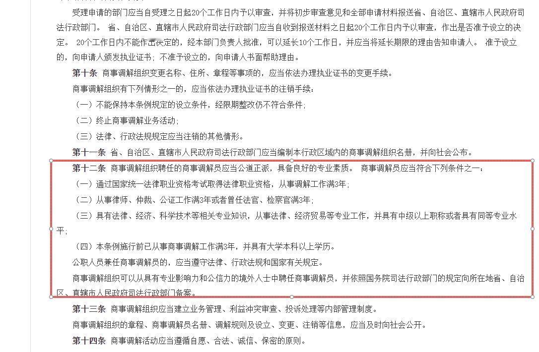 除此之外,第十二条也明确了,商事调解组织聘任的商事调解员应当公道正派,具备良好的专业素质。 商事调解员应当符合下列条件之一:
