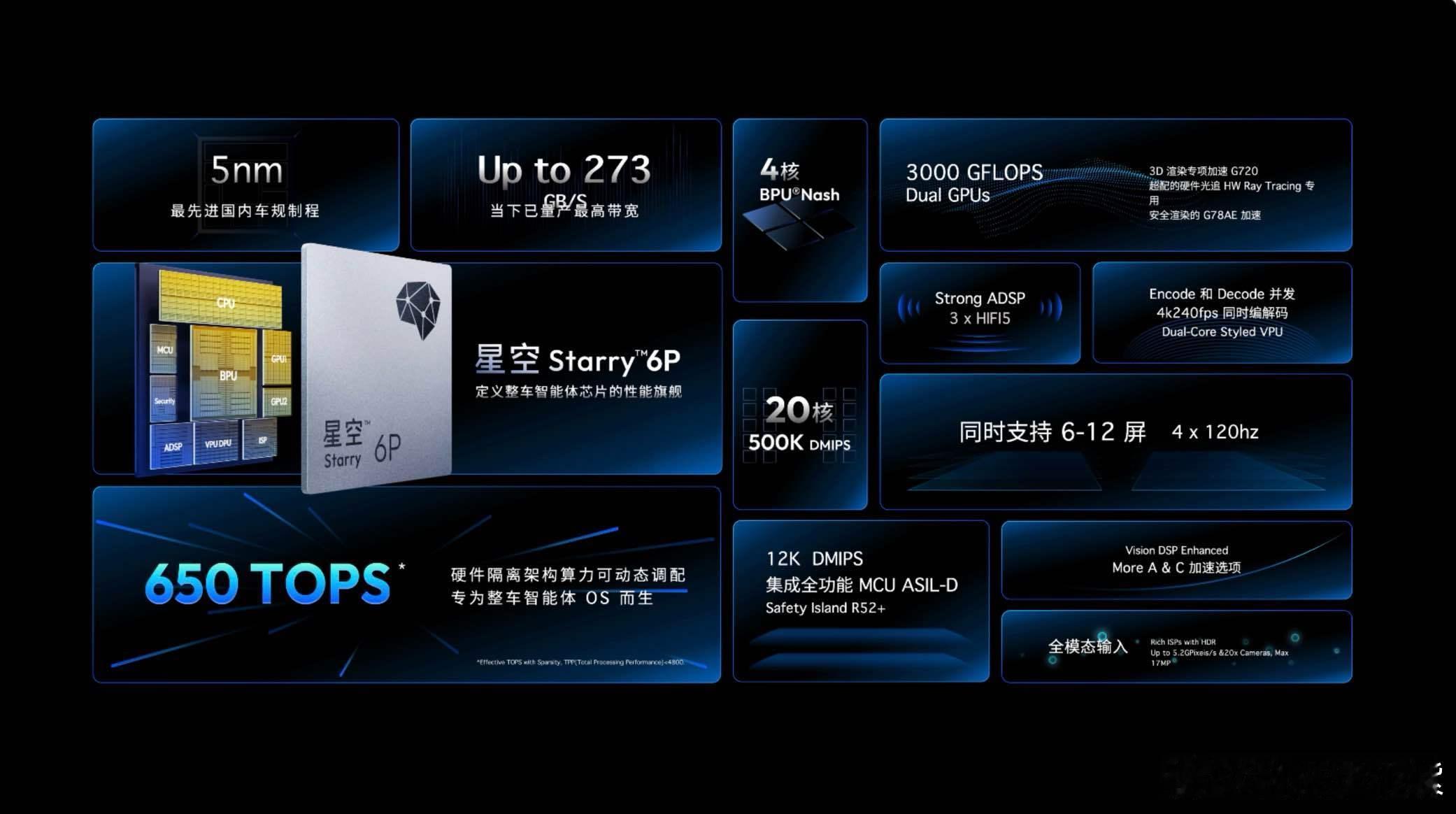 中国首款整车智能体芯片星空地平线星空系列基于全阶产品布局,推出星空 Starry 6P、6H芯片。星空 Starry 6P 作为中国首款舱驾融合整车智能体芯片,它以 5nm制程、650TOPS算力和273GB/s 带宽,实现顶级智舱、智驾与端侧大模型性能的全面领先。更重要的是,它通过集成架构创新,实现了空间、器件与成本的三重优化。甚至能让同样的DDR资源支撑翻倍产能,用硬核技术重构智能车的成本与性能边界。从PC芯片到手机芯片的发展早已证明:高频刚需、强耦合、低时延的核心能力,终将从外挂模块走向 SoC 集成。如今智能汽车迈入舱驾一体与中央计算时代,同样在遵循这一产业规律。