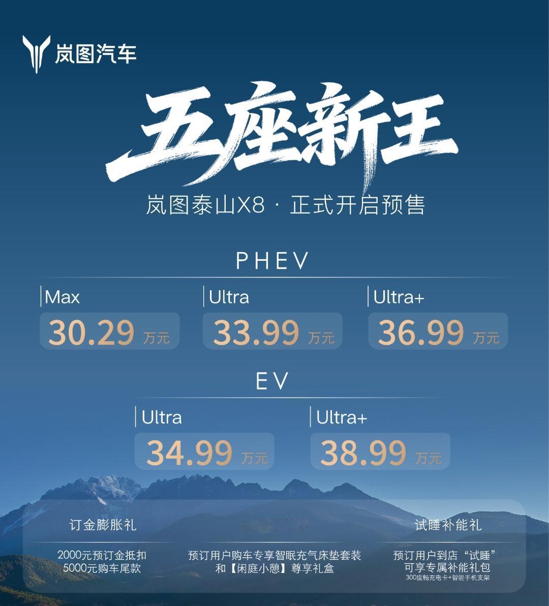 先说一下岚图泰山X8的预售价吧,这款车提供Max、Ultra、Ultra+三个版本及超混、纯电两种动力,具体价格如下: