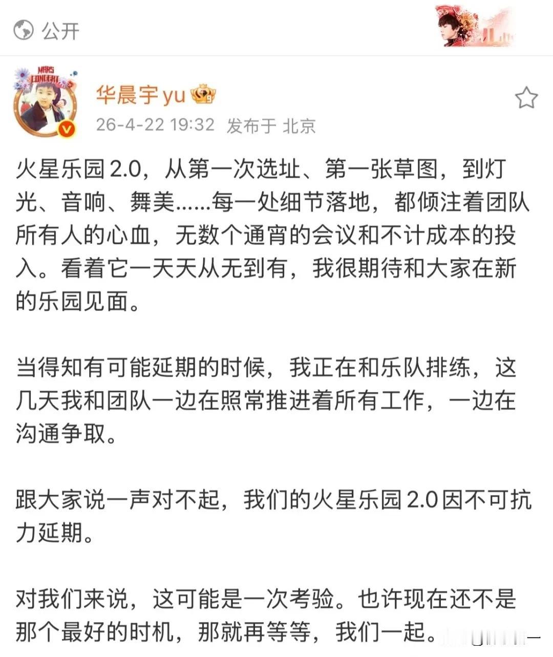 4月22日晚上华晨宇火星演唱会乐园2.0就宣布延期,华晨宇这是摊上啥事了[捂脸]